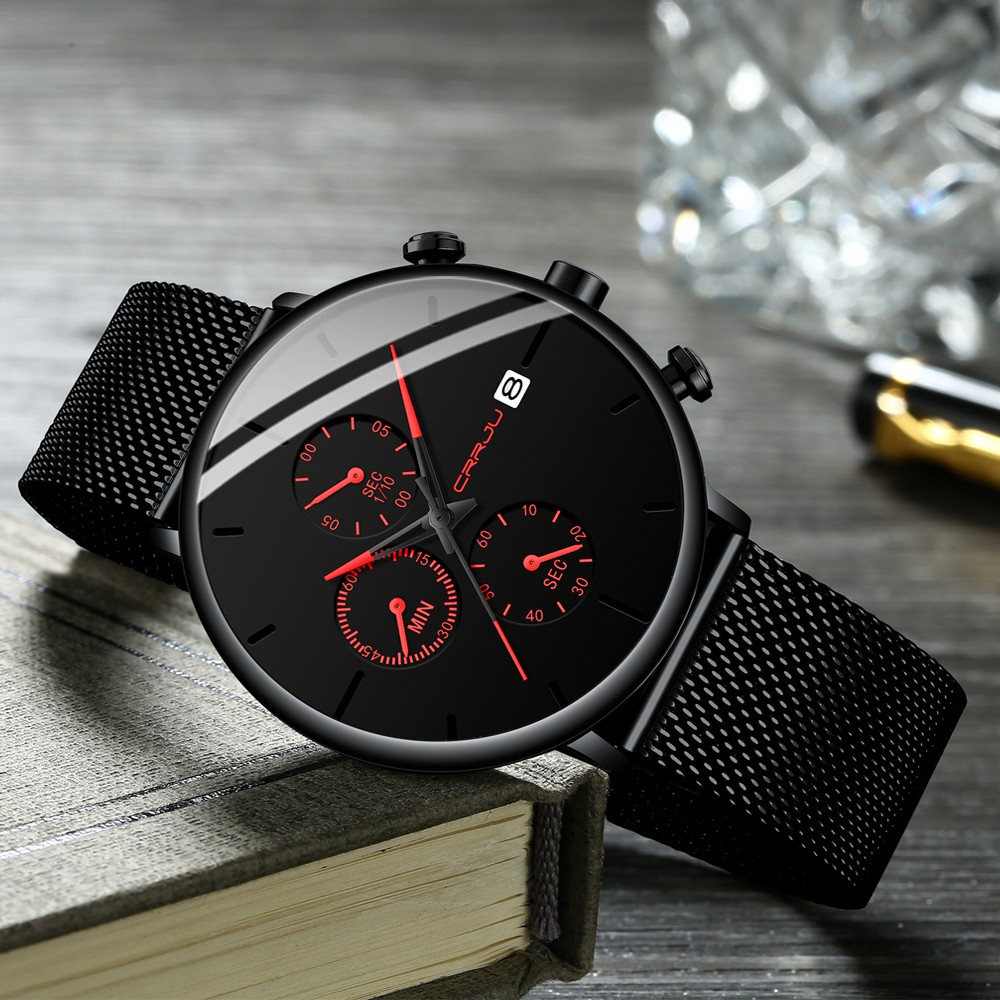Mens Relógios CRRJU Luxo Sport Original Data Auto Cinta De Malha De Aço Inoxidável Casual Quartzo 2268