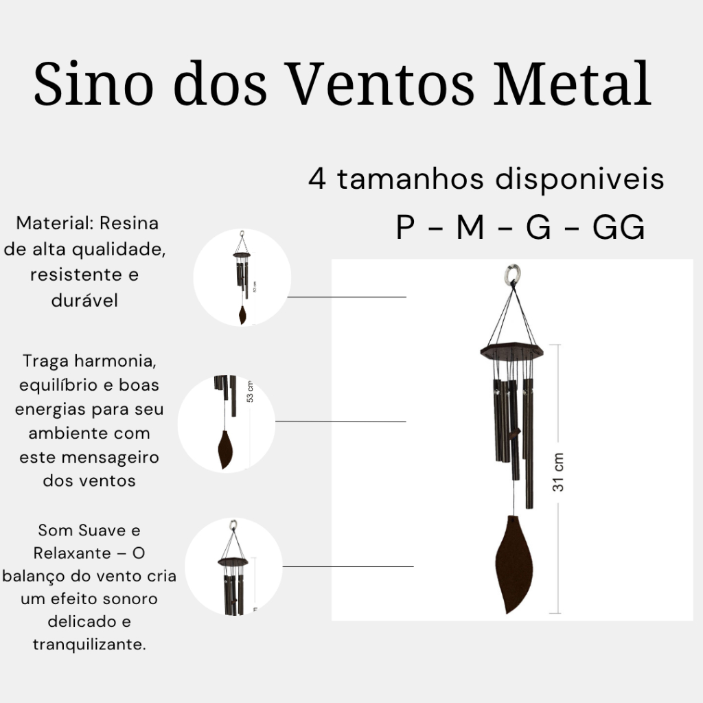 Mobile Mensageiro dos Ventos- Feng Shui 🍃 Traga harmonia, equilíbrio e boas energias para seu ambiente com este mensageiro dos ventos um item essencial no Feng Shui. Com um som suave e relaxante, ele ajuda a purificar as energias do espaço, tornando-o mais sereno e acolhedor. 🔔 Destaques do Produto: ✔️ Energia Positiva e Proteção – Segundo o Feng Shui, equilibra e purifica as vibrações do ambiente. ✔️ Material Natural e Sustentável – Produzido em METAL de alta qualidade, eco-friendly e durável. ✔️ Som Suave e Relaxante – O balanço do vento cria um efeito sonoro delicado e tranquilizante. ✔️ Design Artesanal – Ideal para decorar jardins, varandas, salas e áreas externas. ✔️ Dimensões Ideais – Comprimento: 10 cm | Largura: 10 cm | Altura: 50 cm | Peso: 130 g. ✔️Presente ideal: Para quem aprecia arte, natureza, espiritualidade e harmonia 5 Tubos de Alumínio. 📏 Tamanhos Disponíveis: P (Pequeno Pequeno): 31 cm de comprimento total M (Pequeno): 43 cm de comprimento total G (Médio): 53 cm de comprimento total GG°2 (Grande): 70 cm de comprimento total 💝 Oferta especial para quem valoriza beleza, serenidade e energia positiva no lar!