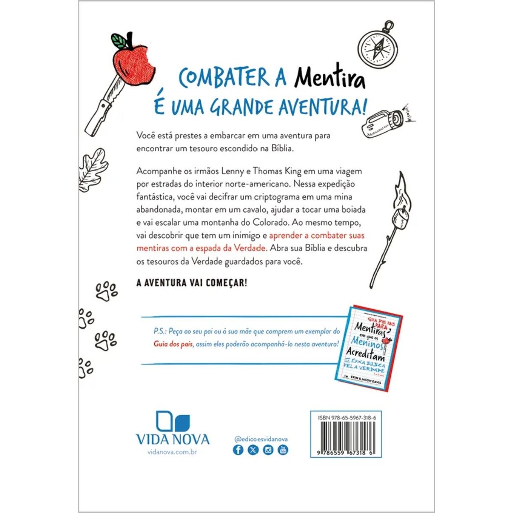 Mentiras em que os meninos acreditam e a épica busca pela verdade | Erin Davis | Jason Davis Combater a mentira é uma grande aventura Você está prestes a embarcar em uma aventura para encontrar um tesouro escondido na Bíblia. Acompanhe os irmãos Lenny e Thomas King em uma viagem por estradas do interior norte-americano. Nessa expedição fantástica, você vai decifrar um criptograma em uma mina abandonada, montar em um cavalo, ajudar a tocar uma boiada e vai escalar uma montanha do Colorado. Ao mesmo tempo, vai descobrir que tem um inimigo e aprender a combater suas mentiras com a espada da Verdade. Abra sua Bíblia e descubra os tesouros da Verdade guardados para você. Detalhes: Título: Mentiras em que os meninos acreditam e a épica busca pela verdade Autores: Erin Davis e Jason Davis Páginas: 224 Dimensões: 15 x 22 cm Capa: brochura Editora: Vida Nova
