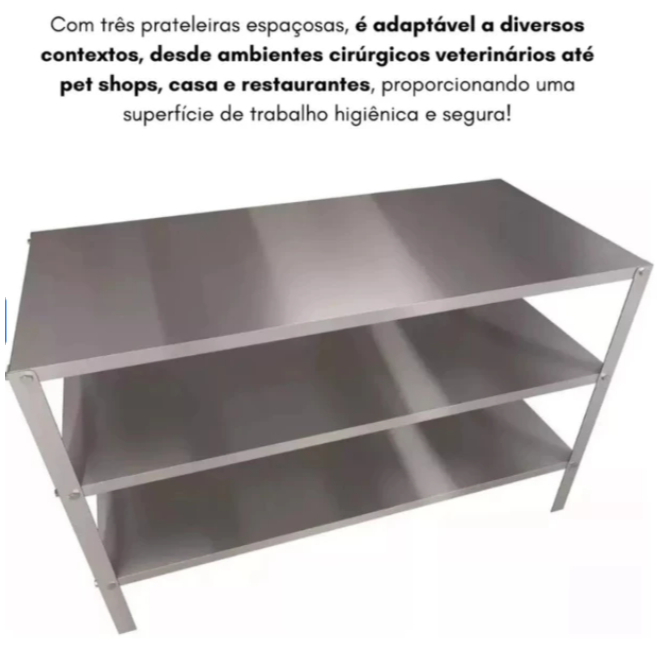 | Mesa Aço Industrial 90x50x81cm com 3 Prateleiras – Ideal para Cozi... este produto | R$ 268,77 | 40% | 4.3/5 | 6 |