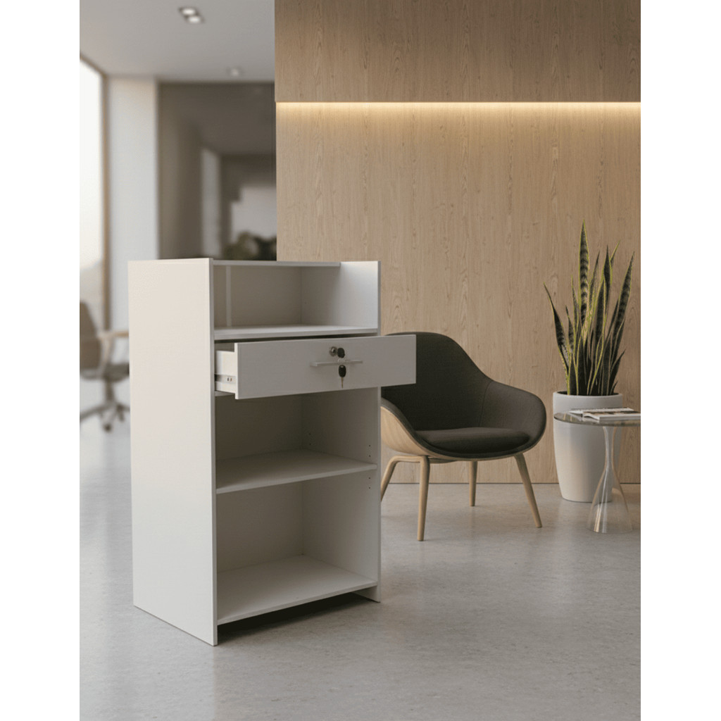 Balcão de Atendimento / Recepção com Gaveta e Chave – Funcional e Compacto O balcão de atendimento ideal para recepções, lojas, escritórios, consultórios e ambientes comerciais que precisam de organização e praticidade no dia a dia. Com design moderno e estrutura compacta, ele se adapta facilmente a diferentes espaços. Possui 1 gaveta com chave, garantindo segurança para documentos, dinheiro ou objetos pessoais. Conta também com 3 prateleiras internas, oferecendo ótimo espaço para armazenamento de materiais, pastas, caixas ou produtos. A corrediça simples da gaveta permite um uso prático e funcional. Fabricado em material resistente, é uma excelente opção para quem busca um móvel funcional, de fácil montagem e com ótimo custo-benefício. Características: 1 gaveta com chave 3 prateleiras internas Corrediça simples Design moderno e profissional Ideal para recepção, caixa, loja ou escritório Dimensões aproximadas: Altura: 109 cm Largura: 57 cm Profundidade: 39 cm Produto enviado desmontado, com manual para fácil montagem.