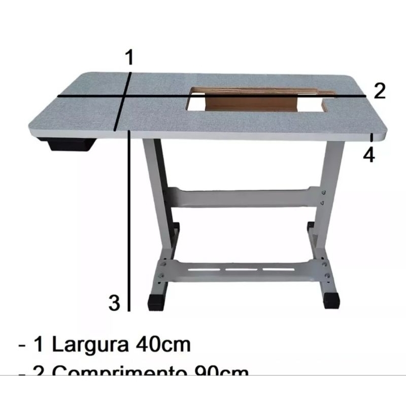 MESA TAMPO 90x40cm COM PÉS DE FERRO PARA MÁQUINA DE COSTURA DOMÉSTICA As mesas domésticas são bem parecidas com as mesas industriais, não possuem rodízios mas são bem versáteis e podem ser adaptadas pra muitos tipos de utilização. Esse móvel serve para máquinas de costura Singer, Elgin, Vigorelli (pretinha, verdinha, vermelha) e muitas outras marcas. Todas as máquinas antigas com medidas de 37x18cm que tenham os dois furos na parte de trás para encaixe das dobradiças vão servir nesse móvel. • MATERIAL: Tampo de MDF de 18mm de espessura. Pés de aço 1020 em formato de chapa U. • MEDIDAS Abertura da máquina: 37x18cm; Distância entre um pino e outro: 24,5cm. • ITENS INCLUSOS: - Mesa completa com tampo e pés (O PRODUTO VAI DESMONTADO); - Kit completo de parafusos para montagem das peças; - Gaveta plástica e aparador de óleo plástico; Compatível Com Máquina 4411 4423 4432 5511 5523 5532
