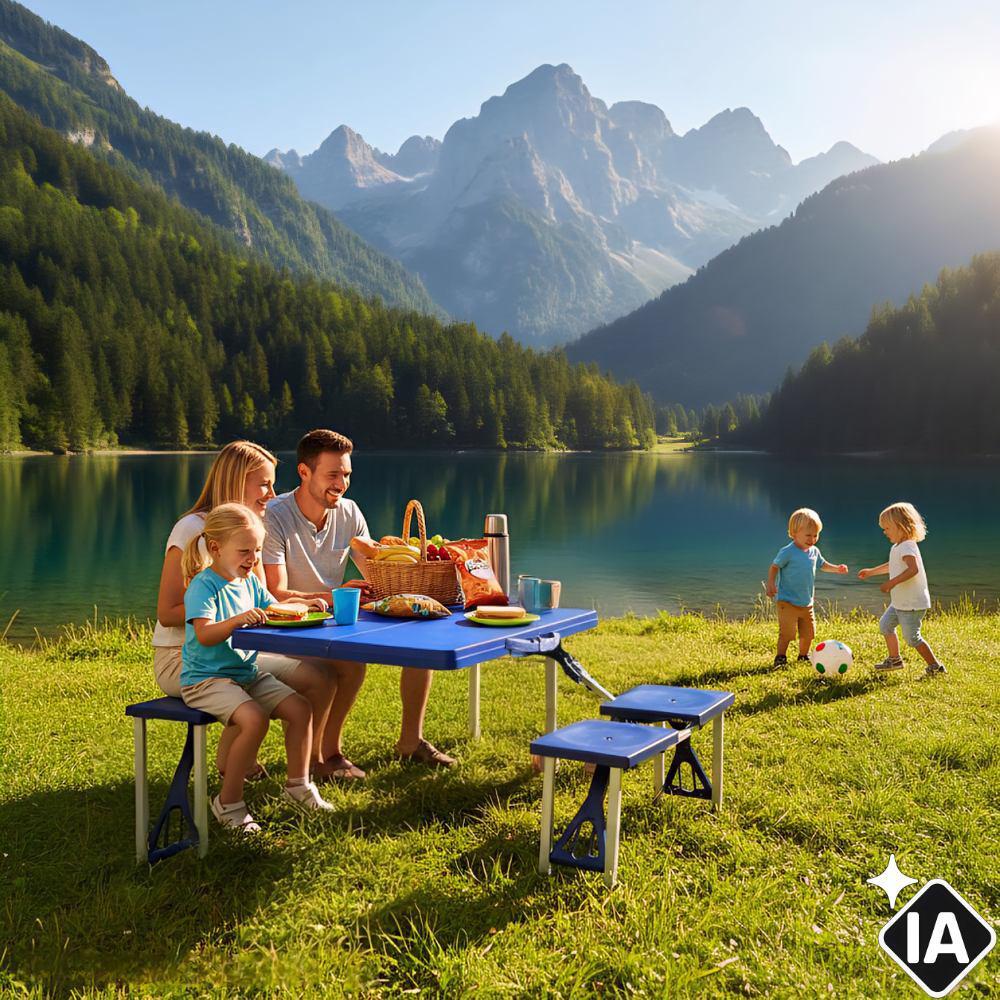 Mesa Camping Portátil Dobrável 136x65cm 4 Banquetas Tipo Maleta Azul Para Acampamento Pesca Passeio Viagem Praia ZELT
