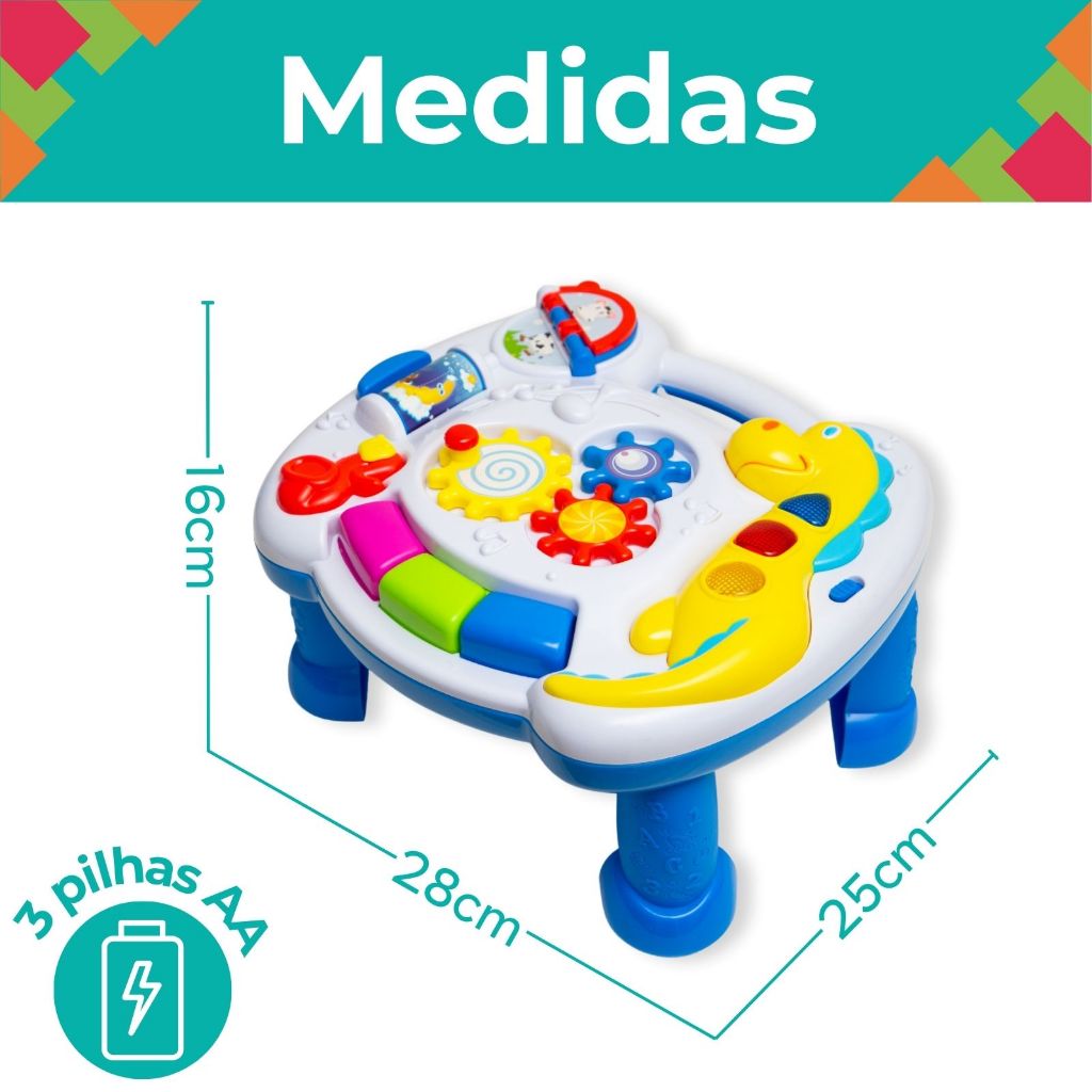 MESA CRIATIVA DIDÁTICA PARA BEBÊ ATIVIDADE INFANTIL - ATENTU A Mesa Interativa Para Bebê é um brinquedo educativo que estimula os sentidos e auxilia no desenvolvimento dos pequenos a partir dos 12 meses de idade! Com cores vibrantes, luzes e sons, ela atrai a atenção do bebê, promovendo estímulos visuais e auditivos. Além disso, sua versatilidade permite o uso no chão, no carro ou até mesmo pendurada no berço, garantindo diversão e aprendizado em qualquer momento do dia! CONTEÚDO DA EMBALAGEM: * 1 Mesa Infantil de Atividades Didáticas; * 4 Pezinhos; * 2 Alças de suporte; * 1 Manual de instruções. ESPECIFICAÇÕES: * Mesa Didática De Atividades; * Com Luz e Som; * Pernas removíveis; * Alças para pendurar no berço ou carro, inclusas; * Feito em plástico resistente; * Necessita 3 Pilhas AA (não inclusas); * Certificação INMETRO 007309/2024; * Marca: ATENTU. DIMENSÕES DO PRODUTO COM PERNAS: * (CxAxL): 28 x 16 x 25cm; DIMENSÕES DO PRODUTO SEM PERNAS: * (CxAxL): 28 x 6 x 25cm; IMPORTANTE: * Garantia: 3 Meses a partir da data de recebimento - para defeitos de fabricação (não cobrimos mau uso). *Todos os Direitos Reservados Em caso de cópia dessa descrição e fotos, os responsáveis serão cobrados de acordo com a Lei (9.610/98) de Direitos Autorais.* Garantia do vendedor: 90 dias