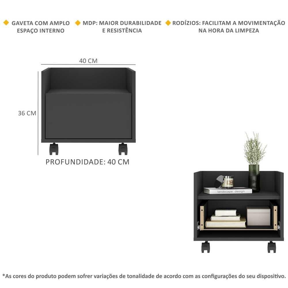 A Mesa de Cabeceira 40 cm com Rodízios Multimóveis é uma solução prática para você deixar o seu quarto mais bonito e complementar seu ambiente. Produzida em MDP com acabamento acetinado (cerca de 20% de brilho), que garante maior durabilidade e facilidade na limpeza, possui 1 gaveta com amplo espaço interno e corrediças metálicas que proporcionam mais leveza no manuseio. Os rodízios facilitam a movimentação do móvel na hora da limpeza. Seu design clean permite que ela seja utilizada em diferentes ambientes, adaptando-se conforme sua necessidade. Conteúdo da Embalagem: 1 (uma) mesa de cabeceira com rodízios Dimensões do produto montado: Altura: 36cm | Largura: 40cm | Profundidade: 40cm *Você pode consultar as medidas internas na imagem técnica do produto. *As cores do produto podem sofrer variações de tonalidade de acordo com as configurações do seu dispositivo. Imagem meramente ilustrativa. Decoração não acompanha o produto. O produto será entregue desmontado e não disponibilizamos o serviço de montagem.