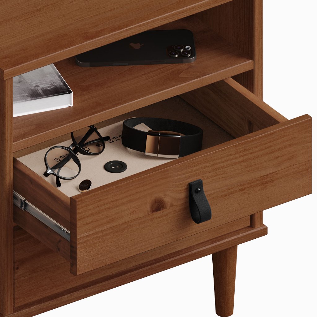A Mesa de Cabeceira Compacta Madeira Maciça Mikka é a escolha perfeita para quem busca elegância, funcionalidade e resistência em um só móvel. Feita em madeira maciça, ela oferece durabilidade superior e um acabamento natural que valoriza os veios da madeira. Seu design escandinavo combina linhas minimalistas com puxadores em couro sintético, trazendo um toque moderno e sofisticado para qualquer ambiente. Com 1 nicho e 2 gavetas espaçosas com corrediças telescópicas, a Mesa de Cabeceira Com Corrediças Telescópicas e Pés Altos Mikka garante praticidade no dia a dia, proporcionando um deslizamento suave e silencioso. Seus pés elevados e angulados dão leveza ao visual e facilitam a limpeza, enquanto suas dimensões compactas (55x45x35 cm) permitem encaixá-la perfeitamente ao lado da cama, na sala ou no escritório. Fácil de montar, resistente e simples de limpar, ela é o móvel ideal para quem valoriza design, qualidade e funcionalidade. Dimensões do Produto Largura: 45 cm Altura: 55,6 cm Profundidade: 35 cm Peso: 10 Kg Materiais e Acabamento Material da Estrutura: Madeira Maciça - Finger Tipo da Madeira: Pinus Fundos da Gaveta: MDF Puxadores: Botão Preto Escala de Brilho: Fosco Material dos Pés: Pinus Maciço Recomendação de Limpeza: Utilize pano levemente úmido Características do Produto Possui Gavetas: Sim Quantidade de Gavetas: 2 Gavetas Estilo: Moderno Suporte: Sim, para livros Ambiente Principal: Quarto Adulto Precisa de Montagem: Sim Sistema de Montagem: Minifix / Cavilhas / Parafusos. Complexidade da Montagem: Médio Volumes: 01 Garantia do Fabricante: 12 meses Montagem: Recomendamos que seja feita por um profissional. Manual de Montagem: Sim Padrão de Cor: Nossa tinta à base de água é uma opção ecologicamente consciente e segura para a pintura, além disso, a tinta a base de água permite uma visualização dos veios da madeira, indicando robustez do produto. Madeira Maciça: Nossa madeira é proveniente de recursos naturais e é tratada de forma ecologicamente correta para o bem do meio ambiente. Sua resistência e vida útil é superior a móveis de chapa MDF utilizadas pelo mercado. Nossa madeira possui mais resistência ao desgaste natural do tempo, agregando mais durabilidade ao seu produto. Pensando na qualidade dos produtos, possuímos equipes de controle de qualidade para selecionar madeiras ideais para seu produto. Diferenciais: - Produto Versátil - Design Moderno - Madeira Maciça - Mais Resistente que MDF - Móvel Sustentável - Madeira Certificada - Pintura Livre de Solventes - MDF Livre de Formaldeído - Produto Qualidade Europeia Informações Importantes: - Montagem e Desmontagem não inclusa ao produto, de responsábilidade do cliente. - Não nos responsabilizamos, no ato da entrega, por subir escadas/elevadores ou transporte por guincho em apartamentos. Eventuais despesas são de responsabilidade do comprador. - Ao receber a mercadoria, o cliente deve verificar as condições da embalagem, caso haja alguma avaria não assine o comprovante de recebimento. - Objetos que ambientam as fotos não acompanham o produto. - Imagens meramente ilustrativas. Cores e tonalidades podem variar. - O conjunto não pode ficar exposto ao Sol ou Chuva.