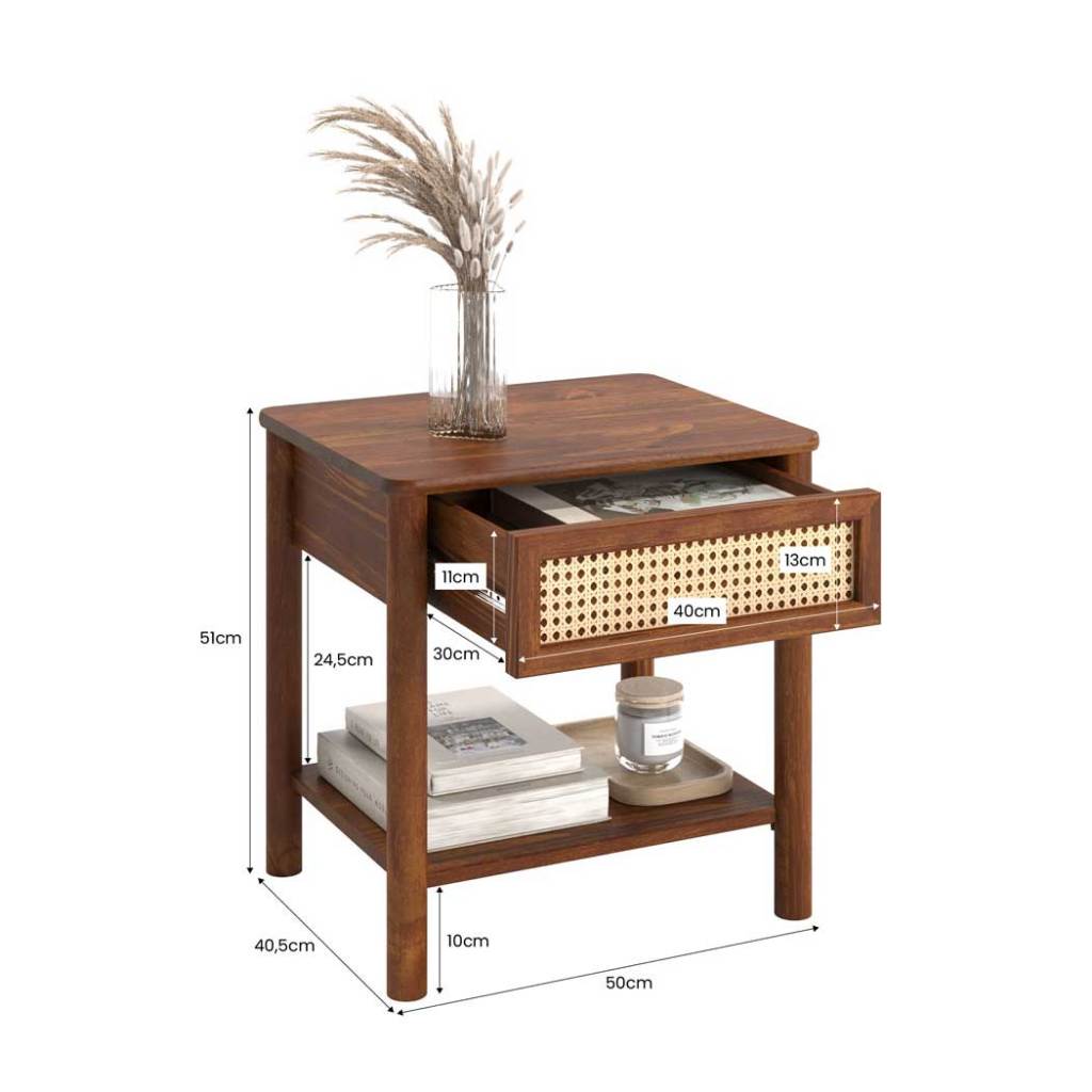 Feito de madeira. Feito para durar. A Mesa de Cabeceira Cefira traduz o equilíbrio perfeito entre o natural e o contemporâneo. Feita em madeira maciça, revela toda a autenticidade dos veios e a leveza da palha natural trançada, aplicada manualmente na frente da gaveta. Cada detalhe reflete cuidado e acabamento refinado, transformando a peça em um ponto de destaque no ambiente. Com gaveta espaçosa e prateleira inferior, oferece funcionalidade na medida certa para apoiar livros, objetos pessoais ou itens decorativos. O tampo amplo acomoda luminárias e acessórios de uso diário, enquanto as corrediças metálicas garantem abertura suave e precisa. O design com bordas arredondadas e proporções equilibradas dá um toque de suavidade ao espaço, adaptando-se com facilidade tanto a dormitórios quanto a salas e halls. A Mesa de Cabeceira Cefira é uma peça atemporal que combina textura, leveza e durabilidade, ideal para quem busca móveis de madeira com alma e personalidade. Dimensões do Produto Largura: 50 cm Altura: 51 cm Profundidade: 40,5 cm Peso: 9 Kg Dimensões da Gaveta: 11 cm (A) x 40 cm (L) x 30 cm (P) Materiais e Acabamento Material da Estrutura: Madeira Maciça - Finger Tipo da Madeira: Pinus Acabamento da Frente da Gaveta: Palha Natural Trançada Escala de Brilho: Fosco Material dos Pés: Pinus Maciço Recomendação de Limpeza: Utilizar pano levemente úmido Características do Produto Quantidade de Portas: 0 Quantidade de Gavetas: 1 Quantidade de Nichos: 1 Quantidade de Prateleiras: 1 Possui Rodízio: Não Estilo: Natural / Contemporâneo Ambiente Principal: Quarto / Sala / Hall Precisa de Montagem: Sim Sistema de Montagem: Minifix / Cavilhas / Parafusos Complexidade da Montagem: Baixa Volumes: 01 Garantia do Fabricante: 12 meses Manual de Montagem: Sim Diferenciais Produto Versátil Design Atemporal Gaveta com Frente em Palha Natural Trançada Madeira Maciça Mais Resistente que MDF Móvel Sustentável Madeira Certificada Pintura Livre de Solventes Produto Qualidade Europeia Informações Importantes Montagem e Desmontagem não inclusa ao produto, de responsabilidade do cliente. Não nos responsabilizamos, no ato da entrega, por subir escadas/elevadores ou transporte por guincho em apartamentos. Eventuais despesas são de responsabilidade do comprador. Ao receber a mercadoria, o cliente deverá verificar as condições da embalagem. Caso haja alguma avaria, não assine o comprovante de recebimento. Objetos que ambientam as fotos não acompanham o produto. Imagens meramente ilustrativas. Cores e tonalidades podem variar. O conjunto não pode ficar exposto ao sol ou chuva.