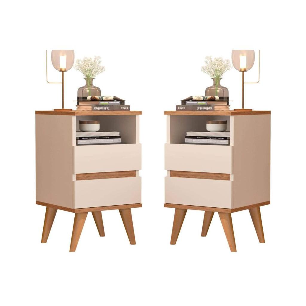 Mesa De Cabeceira Retrô Pés Palito 2 gavetas e Nicho - Pop - Off White/Cedro