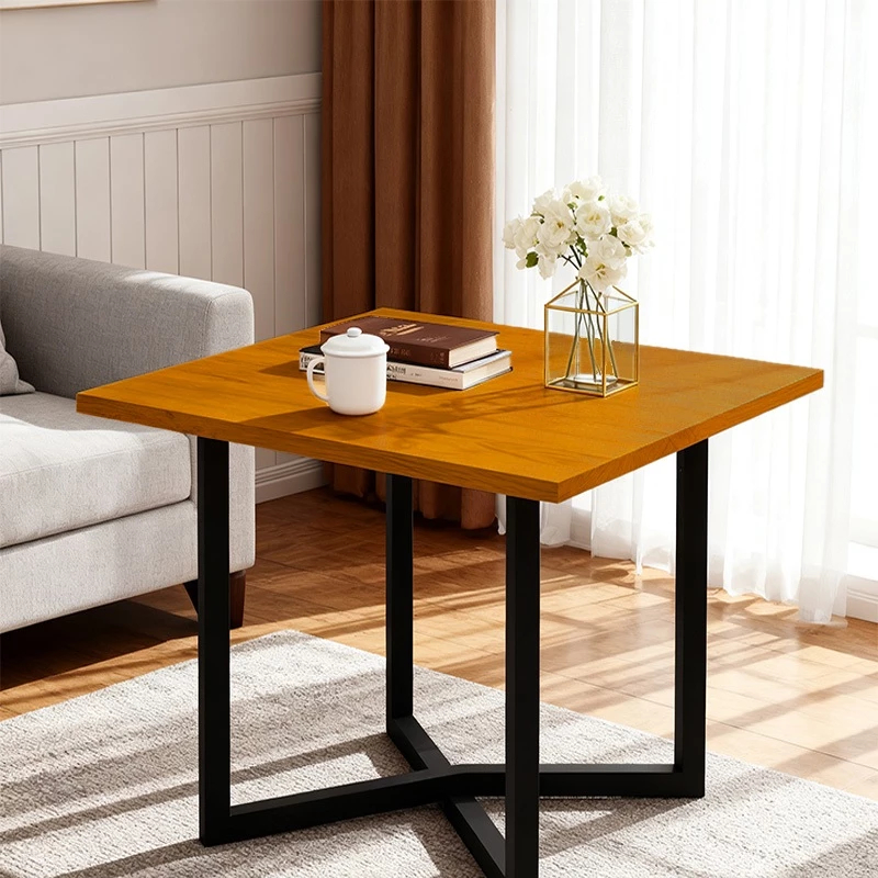 Mesa de centro retrô de ferro forjado, tampo de madeira grosso, sala de estar, varanda, marrom