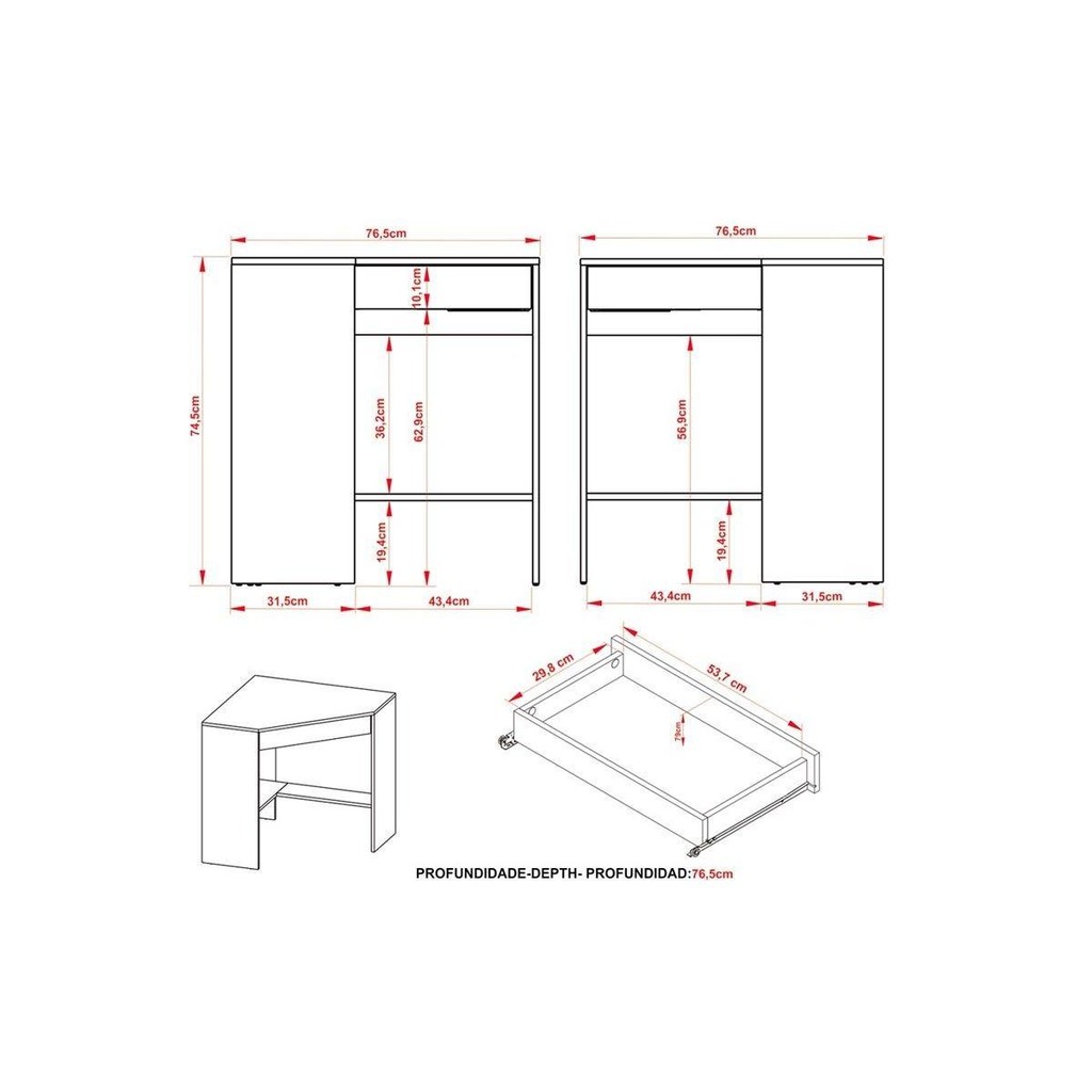 Mesa de Escritório Canto ME4169 c/ 1 Gaveta Branco - Tecno Mobili Marca: Tecno Mobili Dimensões(Cm): Comprimento(Profundidade): 76,5cm x Largura: 76,5cm x Altura: 74,5cm Material de Estrutura - MDP/BP Tipo de Pintura - Pintura em UV (Ultravioleta) Tipo de Acabamento da Pintura - Pintura Semi Brilho Quantidade de Portas - 1 Porta de Abrir Quantidade de Gavetas - 1 Gaveta Quantidade de Prateleiras - 1 Prateleira Garantia - Garantia de 90 dias Montagem do Produto - Desmontável Certificação de Qualidade - Qualidade Aprovada Imagens Meramente Ilustrativas. Não nos responsabilizamos pela montagem/instalação dos produtos. Todas as informações divulgadas são de responsabilidade exclusiva do fabricante/fornecedor. -Verifique com os fabricantes do produto e de seus componentes eventuais limitações à utilização de todos os recursos e funcionalidades - Confira as dimensões do produto e analise se irão passar normalmente por elevadores, portas, escadas e corredores, pois não nos responsabilizamos caso o produto necessite durante a entrega de: Desmontagem, subir escadas ou ser transportado por guincho, cordas para apartamentos. A entrega limita-se ao descarregamento em local que tenha e ofereça total facilidade de acesso normal; - Só fazemos entregas por transportes rodoviários. Não realizamos entregas por transportes fluviais, aéreos e outros diferente de rodoviário. Não realizamos entregas na região norte: Amapá, Amazonas, Pará, Roraima e Acre; - Temos áreas com restrição e dificuldades que os transportadores rodoviários não atendem. Área de difícil acesso, área de risco, área rural, áreas fluviais, estradas não pavimentadas; - Sendo assim, caso seu endereço esteja em área restrita de entrega, a retirada de sua compra deverá ser realizada no CD do transportador ou indicar no momento da compra um endereço entrega fora da área restrita; - Caso realize pedido com entregas em locais de difícil acesso ou áreas com restrição e dificuldades que os transportadores e proprio correios não atendem, a compra sera cancelada pela Costa Rica Colchões, com a devida comunicação e estorno do pagamento ao cliente.