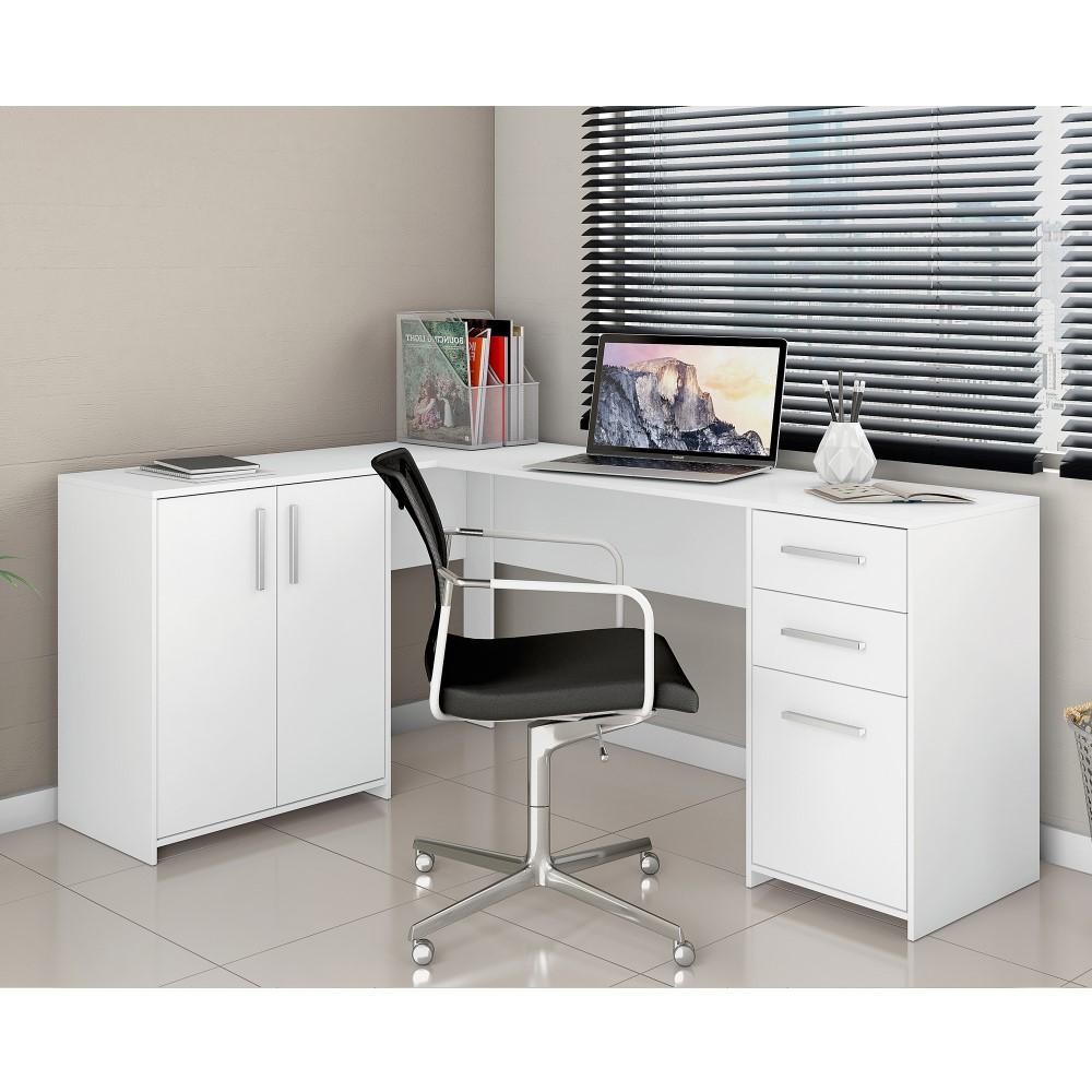 Mesa de Escritório Escrivaninha Em L Home Office Para Computador Quarto 3 Portas 2 Gavetas Branca