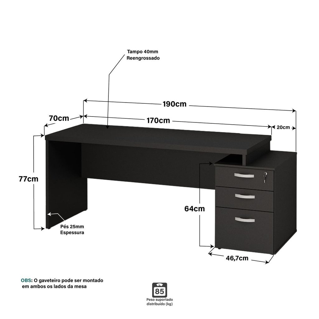 Mesa de Escritório Pedestal 3 Gavetas 190x70cm Preto