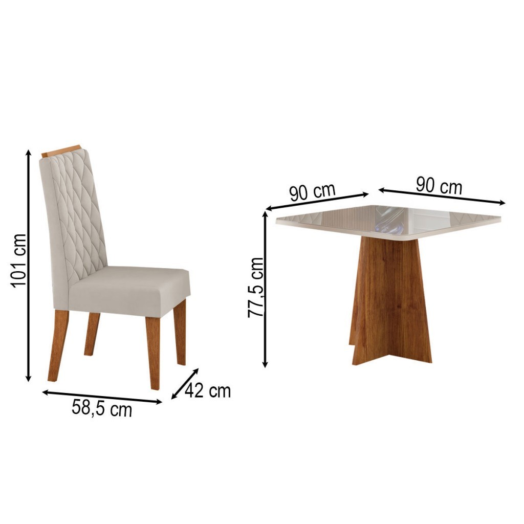Dimensões: - Altura: 77,50 cm - Largura: 90,00 cm - Profundidade: 90,00 cm - Peso: 59,000 kg Descrição: O(a) Mesa de Jantar 4 Lugares Cucina Mel/Blonde/Veludo Pastel - Viero Móveis é produzido em MDF e MDP na escala de brilho Semi-Brilho, e possui um grau de dificuldade de montagem: Médio.Seu revestimento/acabamento é: Pintura UV. Infelizmente a Loja não oferece serviço de montagem, deixamos essa informação bem clara em todas as nossas páginas de produto. Onde especificamos que os móveis chegarão desmontados, e que a montagem fica por conta do cliente. Como não oferecemos esse serviço não embutimos o mesmo no preço dos produtos, ou seja, maior economia para você! Todos os nossos móveis também acompanham o manual de montagem, e caso você queira, pode realizar a montagem você mesmo, sempre especificamos os graus de montagem dos produtos. Nos casos de grau baixo e médio, com pouco ou nenhum conhecimento, você mesmo pode efetuar a montagem, e fazer essa economia. Apenas nos graus de montagem alto, recomendamos a contratação de um montador com experiência, visto que são montagens mais complicadas. A montagem é feita com Parafusos, cavilhas e Minifix.. Este móvel é indicado para que seja utilizado no(a) Sala de Jantar, dando um toque especial no cômodo de sua casa. Para que você mantenha seu produto sempre em ótimo estado, recomendamos que use apenas um pano seco ou levemente umedecido, sem o uso de quaisquer produtos abrasivos. A Loja garante aos clientes, 90 dias de garantia nos produtos, porém, recomendamos que entre em contato com o fornecedor/marca do produto, pois o mesmo(a), pode garantir um prazo maior de garantia. Lembrando ainda que: quaisquer objetos decorativos que aparecem nas imagens, não acompanham o produto. Características: - Espessura da Estrutura: 12,18,25mm - Possui Gavetas?: Não - Possui Portas?: Não - Possui Vidro?: Não - Possui Espelho?: Não - Possui Prateleiras?: Não - Possui Puxadores?: Não - Possui Ripamento?: Não - Linha ou Coleção: Cucina - Montagem Invertida?: Não Pode ser Montado Invertido - Cor interna: Bege - É frágil?: Não - Possui Nicho?: Não - Material da Estrutura: MDF e MDP - Escala de Brilho: Semi-Brilho - Material do Tampo: MDF - Espessura do Tampo (mm): 18 - Possui Rodízios?: Não - Possui Sapatas?: Sim - Possui Pés?: Sim - Pés com regulagem de altura?: Não - Quantidade de Pés/Sapatas: 20 - Altura do Chão até o Assento (cm): 49 - Cadeira Estofada: Sim - Densidade do Assento: D-26 - Densidade do Encosto: D-12 - Enchimento do Assento: Espuma - Enchimento do Encosto: Espuma - Medidas da Cadeira ( A x L x P ): 101 x 42 x 58,5cm - Peso Suportado: 90 Kg - Quantidade de cadeiras por conjunto: 4 - Tecido: Veludo - Material dos Pés: MDF - Acompanha: Mesa de Jantar + 4 Cadeiras + Kit Ferragens + Manual de Montagem - Acompanha Manual de Montagem: Sim - Como os Móveis Chegarão na Minha Casa: Desmontado em caixas, acompanhado de todas as peças, ferragens e manuais para montagem. - Grau de Dificuldade da Montagem: Médio - Necessita de Montagem: Sim - Sistema de Montagem: Parafusos, cavilhas e Minifix. - Acompanha Cadeiras: Sim - Acompanha Tampo: Sim - Formato da Mesa: Quadrada - Material do Tampo: MDF - Peso Suportado no Tampo: 50 Kg - Quantidade de Lugares: 4 - Garantia (dias): 90 - Indicação de Uso: Sala de Jantar - Observação: Objetos decorativos que aparecem nas imagens, não acompanham o produto. - Recomendação de Manutenção: Utilizar pano levemente umedecido, seguido de pano seco. Não utilizar quaisquer produtos abrasivos. - Revestimento /Acabamento: Pintura UV