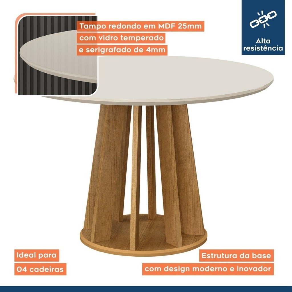 Mesa de Jantar 4 Lugares Redonda 120cm Tampo Vidro/MDF Rose