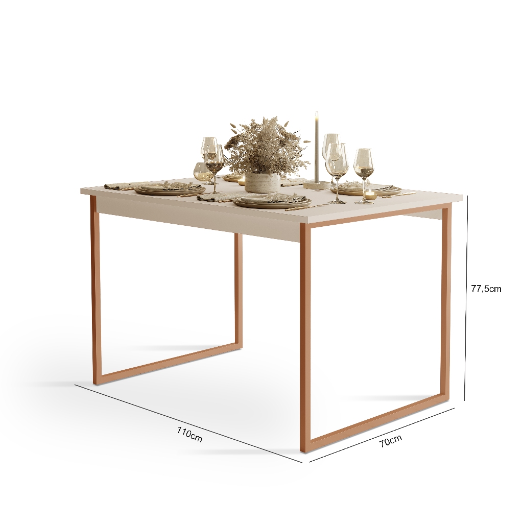 🪑 Mesa de Jantar Moderna 4 Lugares – Estrutura de Aço e Tampo MDF Transforme sua sala de jantar ou cozinha com essa mesa elegante e resistente, perfeita para quem busca design moderno, praticidade e durabilidade em um único produto. ✨ Por que escolher esta mesa? ✅ Design sofisticado que valoriza qualquer ambiente ✅ Durabilidade garantida com tampo MDF 15 mm de alta qualidade ✅ Estrutura em aço com pintura de alta resistência – mais estabilidade e segurança ✅ Compacta e funcional: ideal para apartamentos e espaços otimizados ✅ Versátil: combina com diferentes estilos de decoração 📏 Medidas do Produto: Altura: 77,5 cm Largura: 70 cm Comprimento: 110 cm Capacidade: até 4 lugares confortáveis 🍽️ Perfeita para refeições em família, encontros com amigos ou até para dar um charme extra à sua cozinha. A combinação do tampo amadeirado com a base metálica cobre traz um visual clean e atemporal. 💡 Dica: Combine com cadeiras modernas e crie um espaço acolhedor e cheio de estilo!