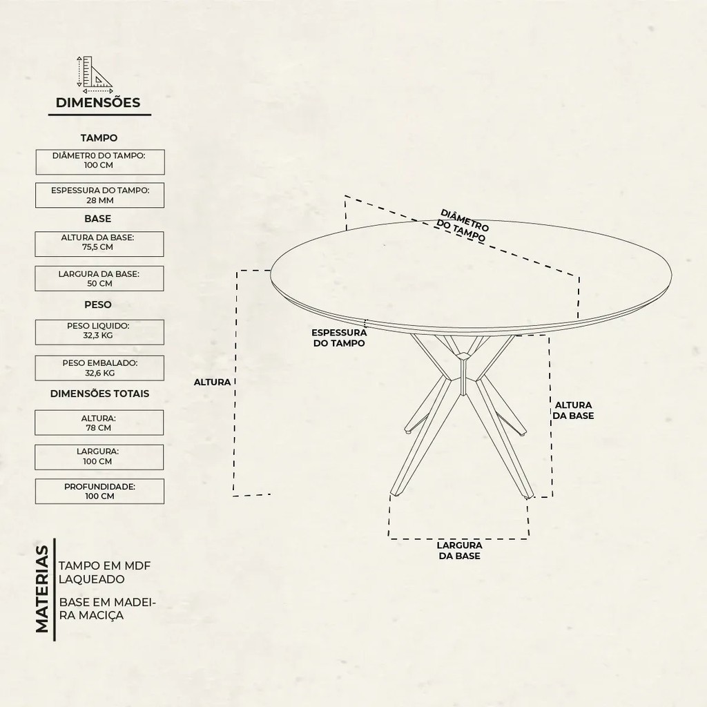 Apresentamos a Mesa de Jantar Acássia, uma peça elegante e versátil que será o ponto central de refeições compartilhadas entre familiares e amigos, seja na sala de jantar, na cozinha ou em ambientes comerciais. Com um design contemporâneo e acabamento de alta qualidade, esta mesa oferece praticidade e estilo para diversos espaços. Estilo: Moderno Atóxico: Não Formato: Redondo Peso (kg): 33 Dobrável: Não Garantia: 03 Meses Altura (cm): 78 Acabamento: Laca Extensível: Não Largura (cm): 100 Possui Vidro: Sim Possui Portas: Não Design da Base: Em X Possui Rodízio: Não Suporta Até (kg): 40 Profundidade (cm): 100 Escala de Brilho: Semi-Brilho Material da Base: Madeira Maciça Serviço Montagem: 114259443 Material do Tampo: Vidro/MDF Origem do Produto: Nacional Acabamento da Base: Verniz Ambiente Principal: Sala de Jantar Espessura do Tampo (mm): 28 Material Principal: MDF Possui Prateleiras: Não Acabamento do Tampo: Laca Quantidade de Lugares: 4 Possui Suporte Giratório: Não Marca: Árvore de Minas Cor do Produto: Off-White Itens Inclusos: TAMPO E BASE Cor Predominante: Branco Linha ou Coleção: Mata Atlântica Medida da Base (A x L x P): 75X50X50 Medida da Mesa (A x L x P): 78x100x100 Medida do Tampo (L x C x E): 100X100X0,28