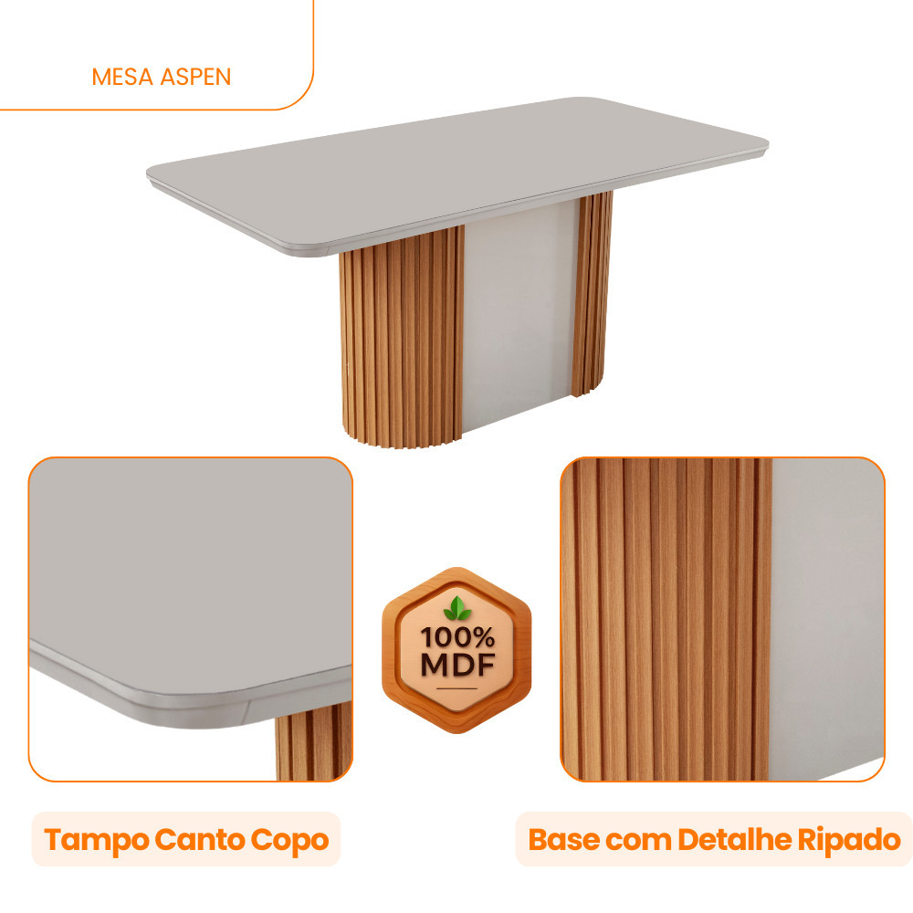 Mesa de Jantar Aspen 180cm Tampo MDF Vidro Canto Copo e 6 Cadeiras Melissa Moderna Mobília