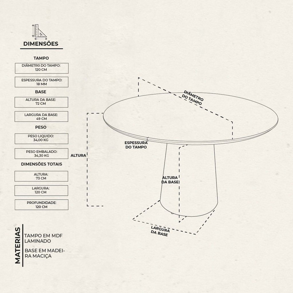 A Mesa Lyon combina robustez e sofisticação, sendo uma escolha elegante para diversos ambientes. Com sua base em madeira maciça e tampo laminado, oferece resistência e um toque de naturalidade que harmoniza com diferentes estilos de decoração. ESPECIFICAÇÕES TÉCNICAS Dimensões Altura: 78 cm Largura: 120 cm Profundidade: 120 cm Espessura do Tampo: 1,8cm Peso Embalado: 7,30 kg Peso Máximo Suportado: 180 kg Materiais Base: Feita com bordas em lâmina de cinamomo, garantindo maior estabilidade Tampo: Laminado em madeira tauari, que alia resistência e beleza natural. Informações Adicionais Cores Disponíveis: Amadeirado Garantia e Durabilidade Garantia: 90 dias contra defeitos de fabricação, assegurando a confiabilidade do produto. Estilo: Clássico Atóxico: Sim Formato: Redondo Peso (kg): 7.3 Dobrável: Não Garantia: 03 Meses Altura (cm): 73 Acabamento: Verniz Extensível: Não Largura (cm): 120 Possui Vidro: Não Possui Portas: Não Possui Rodízio: Não Suporta Até (kg): 140 Profundidade (cm): 120 Escala de Brilho: Semi-Fosco Material da Base: Madeira Maciça Material do Tampo: Madeira Maciça Origem do Produto: Nacional Acabamento da Base: Verniz Ambiente Principal: Sala de Jantar Espessura do Tampo (mm): 18 Material Principal: Madeira Maciça Possui Prateleiras: Não Acabamento do Tampo: PU Quantidade de Lugares: 4 Tipo de Madeira Maciça: Eucalipto Possui Suporte Giratório: Não Marca: Árvore de Minas Cor do Produto: Amadeirado Itens Inclusos: 1 Mesa Cor Predominante: Marrom Medida da Base (A x L x P): 72 x 120 x 120 Medida da Mesa (A x L x P): 72 x 120 x 120 Medida do Tampo (L x C x E): 120 x 120 x 1,8