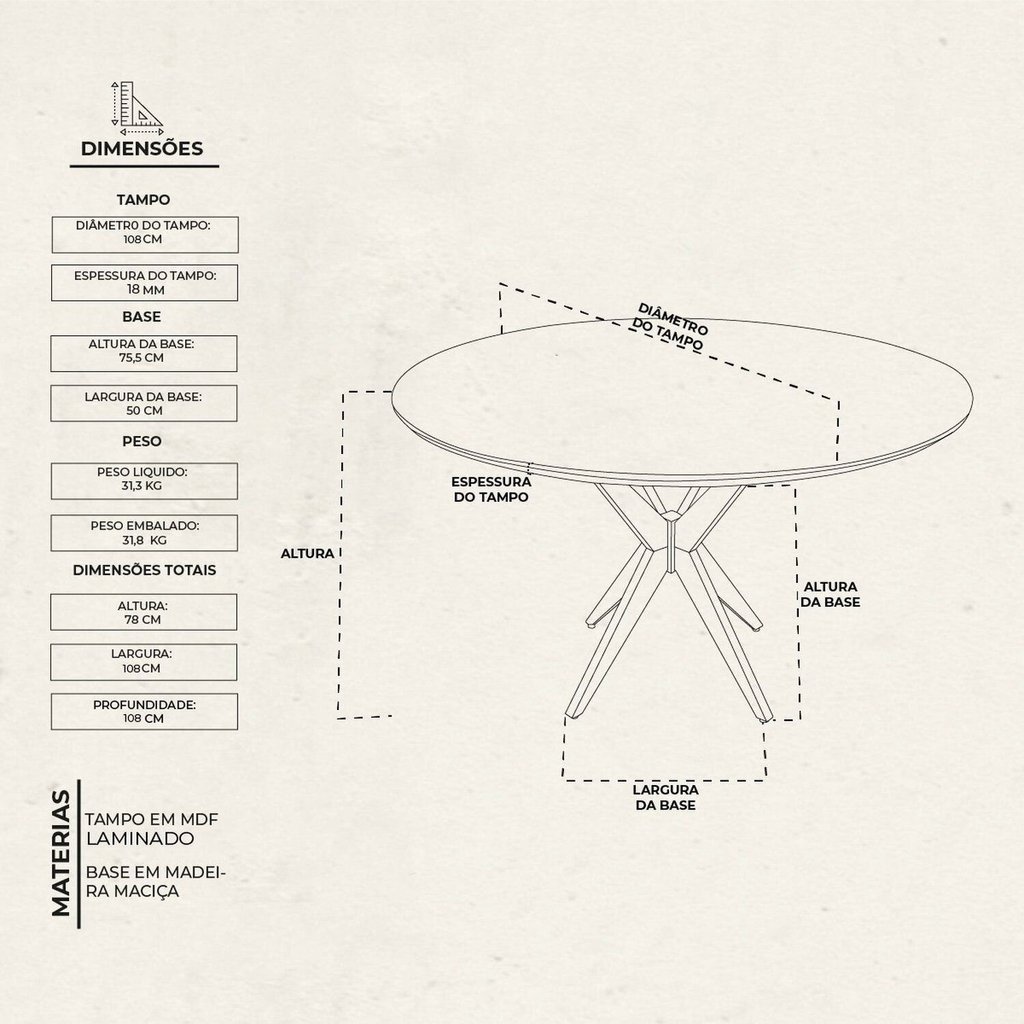 A Mesa Alice é uma peça elegante e funcional, ideal para compor ambientes sofisticados com um toque de charme e naturalidade. Com base em madeira maciça e tampo de tauari vernizado, oferece durabilidade e um design acolhedor. ESPECIFICAÇÕES TÉCNICAS Dimensões Altura: 62 cm Altura da Base: 75,5 cm Largura: 108 cm Profundidade: 108 cm Espessura dos Pés: 4 cm Peso Embalado: 31,60 kg Peso Máximo Suportado: 120 kg Materiais Base: Madeira maciça, proporcionando estabilidade e resistência. Tampo: Madeira de tauari com acabamento em verniz. Informações Adicionais Cores Disponíveis: Amadeirado Garantia e Durabilidade Garantia: 90 dias contra defeitos de fabricação, oferecendo segurança na compra. Durabilidade: Produzida com materiais de alta qualidade para garantir longa vida útil sem perder Estilo: Moderno Atóxico: Sim Formato: Redondo Peso (kg): 31.6 Dobrável: Não Garantia: 03 Meses Altura (cm): 78 Acabamento: PU Extensível: Não Largura (cm): 108 Possui Vidro: Não Possui Portas: Não Possui Rodízio: Não Suporta Até (kg): 120 Profundidade (cm): 108 Escala de Brilho: Fosco Material da Base: Madeira Maciça Material do Tampo: Madeira Maciça Origem do Produto: Nacional Acabamento da Base: Verniz Ambiente Principal: Sala de Jantar Espessura do Tampo (mm): 18 Material Principal: Madeira Maciça Possui Prateleiras: Não Acabamento do Tampo: PU Quantidade de Lugares: 4 Tipo de Madeira Maciça: Eucalipto Possui Suporte Giratório: Não Tipo de Madeira Maciça da Base: Tauari Tipo de Madeira Maciça do Tampo: Tauari Marca: Árvore de Minas Cor do Produto: Amadeirado Itens Inclusos: 1 Mesa Cor Predominante: Marrom Medida da Base (A x L x P): 77,82 x 108 x 108 Medida da Mesa (A x L x P): 78 x 108 x 108 Medida do Tampo (L x C x E): 108 x 108 x 1,8