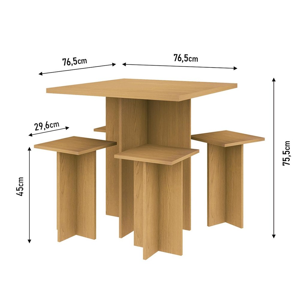 A Mesa de Jantar Genialflex com 4 Bancos é a solução perfeita pra quem quer unir praticidade, conforto e estilo no mesmo ambiente! O grande diferencial desse kit é que os 4 bancos se encaixam direitinho embaixo da mesa, ajudando a economizar espaço e deixando sua sala de jantar ou cozinha sempre organizada. O acabamento no padrão Carvalho Dakar traz aquele toque moderno e acolhedor, que combina fácil com qualquer decoração. Além de linda, é super resistente, feita com materiais de qualidade que garantem durabilidade no dia a dia. Versátil, ela é ideal tanto pras refeições em família quanto pra receber os amigos com muito mais charme e conforto. Um móvel completo, pensado pra transformar seu cantinho em um espaço aconchegante, funcional e cheio de estilo — do jeitinho que você merece! Na Genialflex, a gente acredita que móveis vão além da função: são soluções práticas que deixam sua casa mais bonita, organizada e com o seu jeitinho. Por isso, desenvolvemos peças modernas, resistentes e fáceis de combinar, feitas com cuidado pra oferecer qualidade, design e custo-benefício, transformando ambientes e facilitando sua rotina. ESPECIFICAÇÕES E CARACTERÍSTICAS - Estrutura em MDP FF de 15 mm - Kit completo, a mesa de jantar já acompanha 4 bancos para maior praticidade - Cor/padrão em Carvalho Dakar, combina fácil com qualquer decoração - Acabamento fosco (resistente a riscos) - Design moderno e compacto, ideal para otimizar espaços - Bancos que se encaixam embaixo da mesa, garantindo organização - Estrutura resistente em MDP, com durabilidade e qualidade - Fácil de limpar e manter no dia a dia - Perfeito para cozinhas, salas de jantar e ambientes pequenos PESO SUPORTADO - Mesa até 20 kg distribuídos - Bancos até 80 kg MEDIDAS DA MESA - Largura: 76,5 cm - Altura: 75,5 cm - Profundidade: 76,5 cm MEDIDAS DO BANCO - Largura: 29,6 cm - Altura: 45 cm - Profundidade: 29,6 cm INSTRUÇÕES DE MONTAGEM O produto acompanha kit de ferragens e manual de montagem (serviço de montagem não incluso). CONTÉM NA EMBALAGEM O produto é enviado desmontado em 1 volume, devidamente protegido com papelão, isopor e plástico termoencolhível. TIPO DE FIXAÇÃO A fixação é feita com girofix, cavilhas e parafusos (não é necessário fixar na parede). DÚVIDAS COMUNS O produto é entregue montado? Não, os móveis são enviados desmontados, com um manual e todos os componentes necessários para a montagem. Vocês oferecem serviço de montagem? Não oferecemos serviço de montagem. Qual é o valor da entrega? O valor da entrega é calculado de acordo com o CEP de destino. Os produtos são novos? Sim, todos os nossos produtos são novos. Vocês entregam em todo o Brasil? Sim, realizamos entregas para todo o território nacional. LIMPEZA Para a limpeza, use um pano levemente umedecido com água. Evite produtos abrasivos e esponjas de aço. GARANTIA Cobertura de 3 meses contra defeitos de fabricação. CONSIDERAÇÕES IMPORTANTES - Durante a montagem, as peças devem ser montadas com a parte de trás voltada para cima, apoiando o móvel sobre o papelão da embalagem para evitar danos. - Evite o contato com fontes de calor ou umidade. - As imagens são meramente ilustrativas e os objetos decorativos não estão inclusos. - As cores podem variar dependendo da configuração da tela do dispositivo. - A entrega será realizada até a porta de entrada ou portaria do endereço informado. Caso autorizado pela portaria, o produto será deixado no andar térreo. O transporte até o interior do imóvel é responsabilidade do cliente.