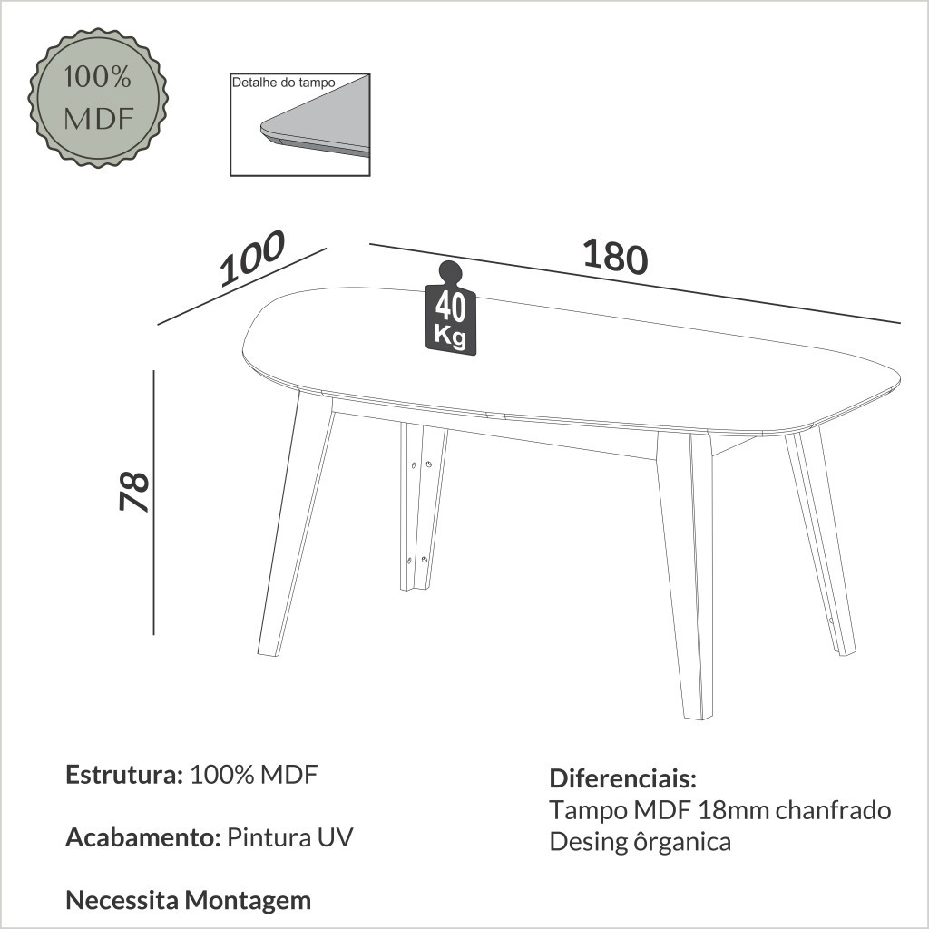 Descrição: A Mesa de Jantar TM88 combina design sofisticado e funcionalidade para transformar seu ambiente. Com formato orgânico e linhas curvas elegantes, ela acomoda até 6 lugares com conforto. Sua estrutura é fabricada em 100% MDF de 18mm, garantindo resistência e durabilidade. Pintura UV em Freijó realça os tons quentes, enquanto o tampo em Off White traz um toque contemporâneo e sofisticado. Ideal para compor salas de jantar modernas e aconchegantes. A compra do produto não acompanha montagem/desmontagem. Cadeiras e objetos decorativos não acompanham o produto. As cores dos objetos podem sofrer alterações devido à luminosidade, configurações do monitor e até mesmo a percepção do usuário. Imagens meramente ilustrativas. Características: - Material da Estrutura: 100% MDF - Espessura da Estrutura: 9 mm e 18 mm - Possui Gavetas?: Não - Possui Portas?: Não - Possui Espelho?: Não - Possui Prateleiras?: Não - Possui Puxadores?: Não - Possui Pés?: Sim - Quantidade de Pés: 4 - Material dos Pés: MDF - Possui Rodízios ?: Não - Linha: Lisboa - Tipo: E-commerce - Necessita de Montagem: Sim - Grau de Dificuldade da Montagem: Médio - Sistema de Montagem: Parafusos, cavilhas e Minifix. - Pode Ser Montado Invertido?: Não - Como os Móveis Chegarão na Minha Casa: Desmontado em caixas, acompanhado de todas as peças, ferragens e manuais para montagem. - Escala de brilho: Fosco e Brilho - Garantia (dias): 180 - Indicação de Uso: Sala de Jantar - Observação: Objetos decorativos que aparecem nas imagens, não acompanham o produto. Imagens meramente ilustrativas. Produtos do mesmo modelo ou de modelos diferentes podem apresentar variações de tonalidade. - Recomendação de Manutenção: Para conservar a cor e os aspectos originais do produto, leve em consideração: Levantar a peça ao deslocá-la, o que ajuda a evitar danos à base e aos pés; Não utilizar água em abundância na peça, somente um pano levemente umedecido para a limpeza ou um espanador seco; Utilizar panos preferencialmente brancos, para evitar manchas e seque bem o móvel após a limpeza; Utilize somente água, nunca produtos químicos, abrasivos, solventes, ceras, sabonetes não neutros ou produtos de limpeza doméstica, visto que podem danificar o acabamento; Não coloque objetos quentes diretamente em cima do móvel para não causar bolhas, manchas ou outros danos, opte por utilizar um apoio; Se possível, não exponha sua peça diretamente ao sol, utilize cortinas ou persianas para bloquear os raios de luz, para que a pintura não desbote. Esses cuidados são muito simples e auxiliarão seu produto a permanecer em perfeito estado por muitos anos. - Revestimento /Acabamento: Pintura UV - Formato da Mesa: Oval - Acompanha Cadeiras: Não - Quantidade de Lugares: 6 - Acompanha Tampo: Sim - Material do Tampo: MDF - Peso Suportado no Tampo: 40 kg - Possui Vidro: Não - Vidro Temperado: Não
