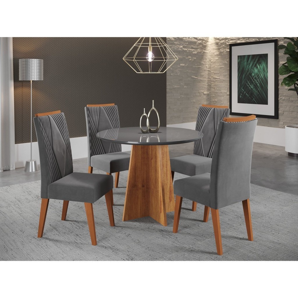 Mesa de Jantar Redonda Riu com 4 Cadeiras Madeira Maciça Vegas Mel/Grafite