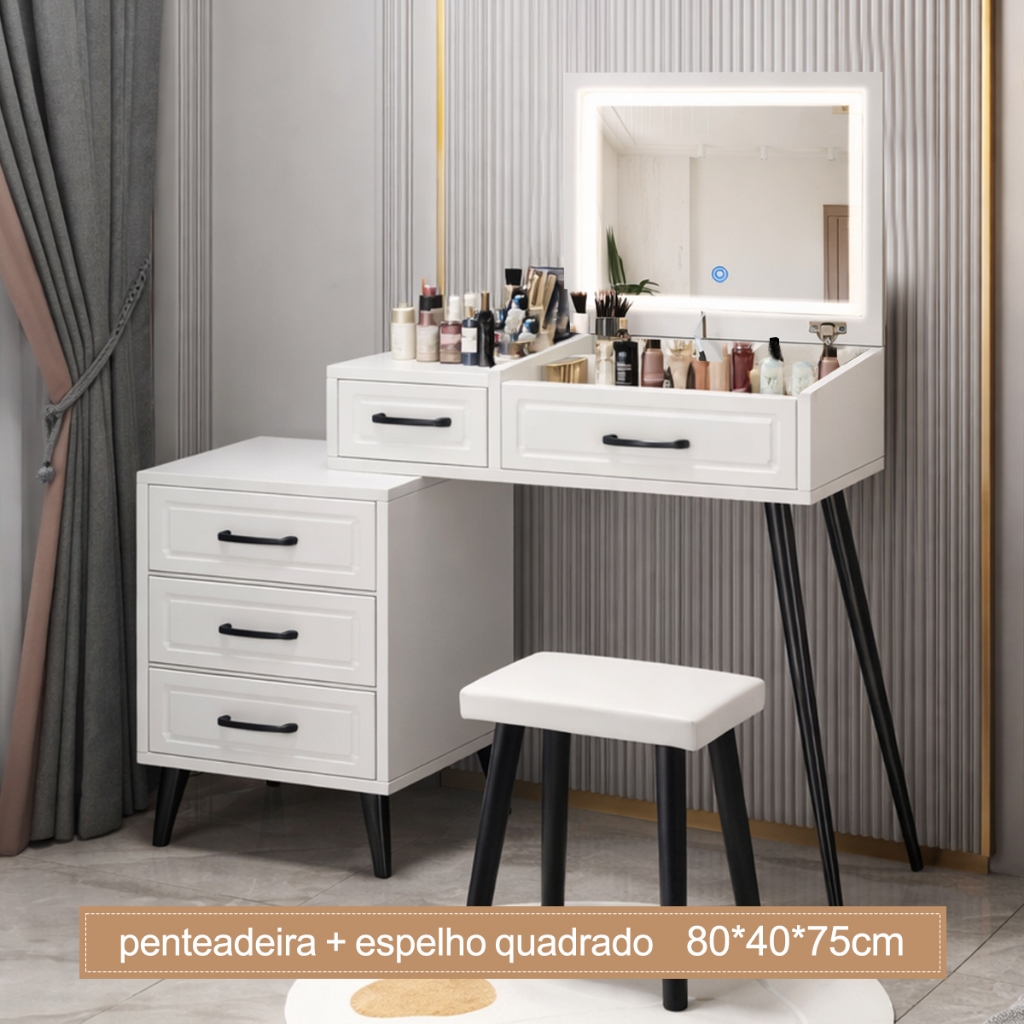 🌟 Espelho de Toucador com Iluminação LED Tripla e Armazenamento Inteligente Eleve sua rotina de beleza e organização com um móvel que une design moderno, funcionalidade e iluminação profissional. 💡 Iluminação LED Inteligente – 3 Modos de Luz Três opções de iluminação ajustável — luz natural, quente e fria — para atender diferentes necessidades de maquiagem e cuidados com a pele. A iluminação é suave, confortável aos olhos e garante reprodução fiel do tom da pele. ✔ A luz acende automaticamente ao abrir o espelho, trazendo praticidade no dia a dia. 🪞 Espelho com Compartimentos Ocultos O espelho articulado pode ser aberto, revelando divisórias internas inteligentes, ideais para organizar cosméticos, produtos de skincare, acessórios e pequenos itens, mantendo tudo sempre ao alcance e a bancada livre de bagunça. 📦 Armazenamento Multifuncional Compartimentos internos atrás do espelho para máxima organização Gaveta inferior + nicho aberto, perfeitos para itens de uso diário, combinando discrição e praticidade 🪑 Dimensões Mesa: 80 × 40 × 75 cm Banqueta: 23 × 32 × 36 cm 🏠 Dois usos em um só móvel – Economia de espaço Com design compacto e versátil, funciona tanto como toucador quanto como mesa de cabeceira, sendo ideal para ambientes menores. O estilo minimalista combina facilmente com quartos, salas e diversos estilos de decoração. 🛠️ Qualidade e Durabilidade Produzido com materiais resistentes, ferragens de qualidade e placas duráveis, fáceis de limpar e pensadas para uso diário prolongado. ✨ Transforme sua rotina de cuidados em um momento especial. Um móvel que ilumina, organiza e valoriza seu espaço com praticidade e elegância. 🛡 Garantia do vendedor: 3 meses