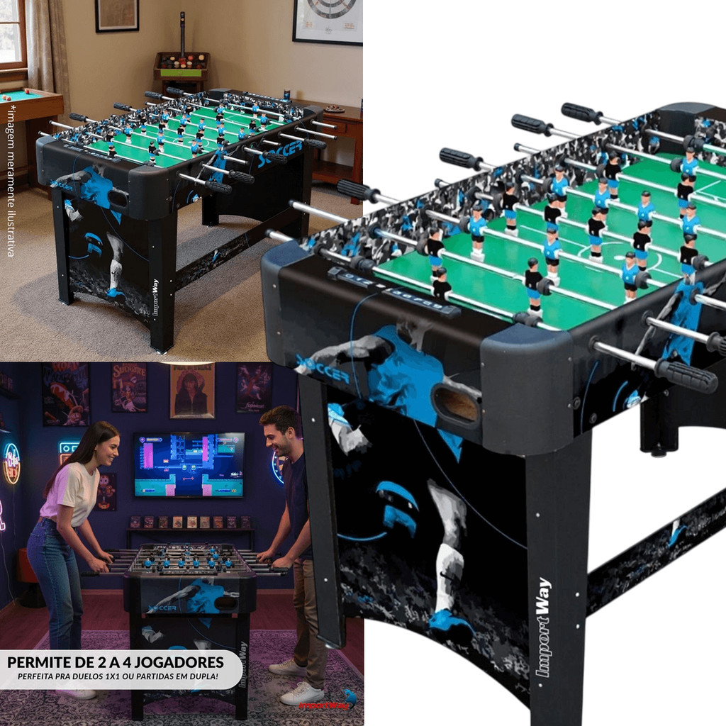 Mesa de Pebolim Importway Soccer A Mesa de Pebolim Importway Soccer IWJ-008 foi desenvolvida para proporcionar partidas equilibradas e seguras entre amigos e familiares. Com estrutura reforçada e componentes de qualidade, garante estabilidade durante o uso e é ideal para ambientes internos, como salas de jogos e áreas de lazer. Por que escolher a Mesa de Pebolim Importway Soccer? Com capacidade para 2 a 4 jogadores, a mesa permite partidas individuais ou em duplas. Possui 22 jogadores fixos em hastes metálicas com pegadores ergonômicos, proporcionando controle e precisão nas jogadas. O marcador de placar manual facilita o acompanhamento da pontuação e o retorno de bola lateral torna o jogo mais dinâmico. Design e estrutura A mesa apresenta design temático de futebol com acabamento em cores modernas e vibrantes. Sua estrutura é composta por MDF e aço, com detalhes em PE e PVC, garantindo firmeza e resistência. O campo possui superfície lisa e laterais elevadas para manter a bola em jogo, enquanto as hastes cromadas com pegadores revestidos asseguram conforto e precisão nas jogadas. Segurança e certificação Produto indicado para maiores de 18 anos, fabricado conforme as normas de segurança e qualidade estabelecidas pelo INMETRO. A montagem deve ser feita em local plano e nivelado, seguindo corretamente o manual de instruções. O uso supervisionado garante maior segurança e durabilidade do produto. Limpeza e manutenção Para conservar a mesa, limpe a superfície com pano macio levemente umedecido e sabão neutro. Evite produtos abrasivos e o contato direto com a umidade. É recomendado verificar periodicamente o aperto dos parafusos e o alinhamento das hastes para manter o bom funcionamento do produto. Cores e acabamento A Mesa de Pebolim Importway Soccer IWJ-008 possui acabamento técnico em tons esportivos, com detalhes que remetem a um campo de futebol. O visual moderno e resistente torna o produto adequado para diferentes tipos de ambiente recreativo. A Mesa de Pebolim Importway Soccer IWJ-008 oferece estabilidade, design esportivo e excelente jogabilidade, sendo ideal para momentos de lazer em casa ou em espaços de convivência. Neste anúncio, você recebera: 1 (uma) Mesa de Pebolim Importway Soccer IWJ-008 22 (vinte e dois) jogadores fixos 3 (três) bolinhas 1 (um) Manual de Instruções Mesa de Pebolim Importway Soccer Modelo: IWJ-008 Marca: Importway Material da estrutura: MDF e aço com detalhes em PE e PVC Campo com laterais elevadas e retorno de bola lateral Quantidade de jogadores: 22 (11 por time) Número de bolas: 3 Marcador de placar manual integrado Capacidade: 2 a 4 jogadores Idade recomendada: maiores de 18 anos Certificação INMETRO 005375/2025 Garantia: 90 dias contra defeitos de fabricação Dimensões do produto: Altura 79 cm x Largura 61 cm x Comprimento 122 cm Dimensões da Embalagem: Altura 11 cm x Largura 64 cm x Comprimento 115 cm Peso: 15,4 kg Atenção: Sempre confira as medidas do produto e da embalagem antes de confirmar a compra, garantindo compatibilidade com seu espaço e transporte.