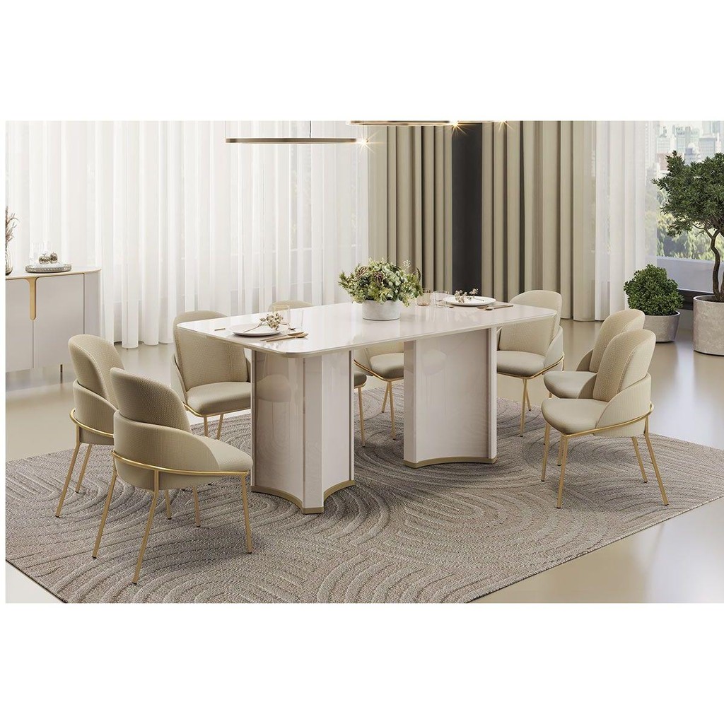 Mesa de Sala Jantar Liz c/ Tampo Madeirado c/ Vidro Curvo 180x100cm Off White/Off White - DJ Móveis