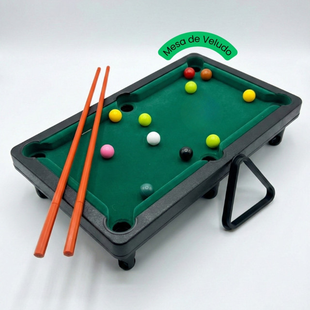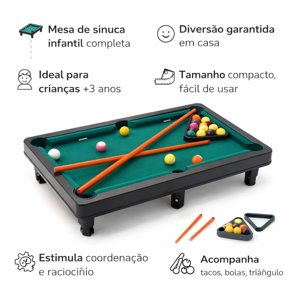 Imagine seu filho longe das telas, concentrado, se divertindo e aprendendo… tudo isso dentro de casa. Essa é a sensação que a Mesa de Sinuca Infantil Aveludada proporciona: diversão de verdade, aprendizado e momentos que viram memória. Hoje, muitas crianças: Se entediam rápido... Passam horas no celular ou tablet... Perdem oportunidades de desenvolver coordenação, foco e raciocínio... E no fundo, todo pai e mãe sente que poderia oferecer algo melhor. A Mesa de Sinuca Infantil Aveludada foi criada para transformar qualquer ambiente em um espaço de: Brincadeira ativa! Aprendizado natural! Convivência em família! Com design realista, tamanho ideal para crianças e acabamento aveludado, ela entrega a experiência da sinuca de forma segura, divertida e educativa. 🌟 Benefícios Transformacionais: 🧠 Estimula raciocínio lógico e estratégia 🎯 Desenvolve coordenação motora e concentração 👨👩👧 Promove interação entre pais e filhos 🏠 Diversão garantida dentro de casa 📱 Menos telas, mais brincadeira de verdade 📦 O que acompanha ✔ Mesa de sinuca aveludada. ✔ 2 tacos infantis. ✔ Bolas coloridas. ✔ Triângulo organizador. ✔ Produto pronto para brincar. Tudo completo — sem precisar comprar nada extra. 🛡️ Segurança & Confiança Indicada para crianças +3 anos. Tamanho compacto e fácil de usar. Material resistente e acabamento seguro. 👉 Garanta agora a diversão que ensina e aproxima!