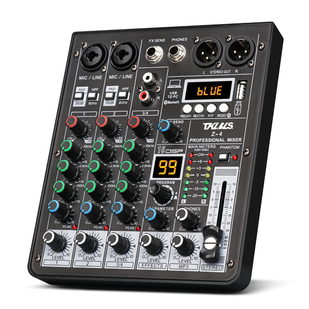 Mesa de som 4 canais Com Mixer Equalizador Efeitos 48v Bluetooth PC Mp3 alimentação USB 12V