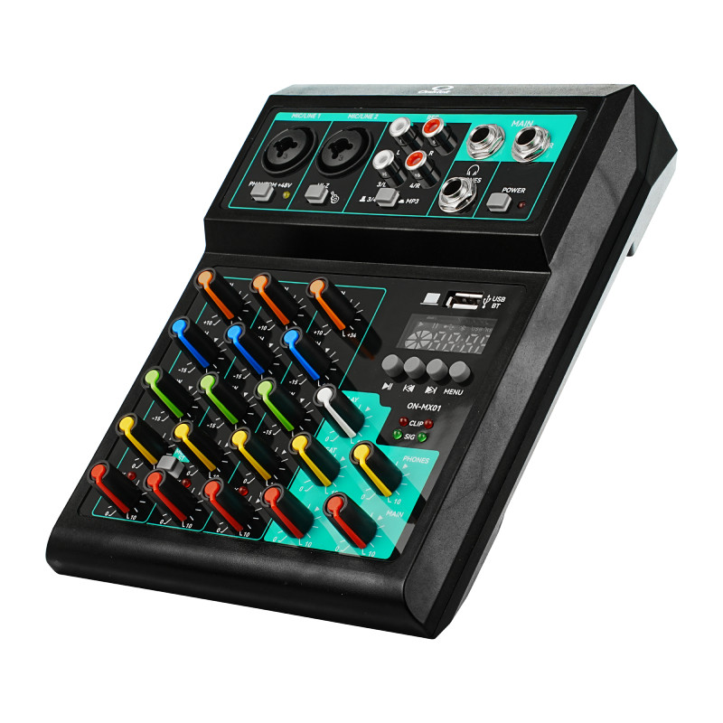 Mesa de Som 4 Canais Knup ON-MX01 oferece desempenho confiável e recursos versáteis para músicos, produtores e entusiastas do áudio. Compacta e funcional, é ideal para gravações, transmissões ao vivo e outras aplicações que exigem qualidade e praticidade. Conta com 4 canais de entrada, incluindo 2 entradas mono e 1 entrada estéreo, além de uma saída REC, permitindo diversas possibilidades de conexão. Equipada com phantom power de 58V, possibilita o uso de microfones condensadores. Também possui função Bluetooth, facilitando a conexão com dispositivos móveis, e efeitos digitais como delay, reverb e repetição, que ampliam as possibilidades criativas. Cada canal conta com controle de agudos e graves, permitindo ajustes finos para melhor qualidade sonora. Com estrutura em material ABS, a mesa é leve e resistente, pesando apenas 428g. Pode ser alimentada tanto via adaptador (7/220V) quanto por porta USB (5V/2A), garantindo praticidade em qualquer ambiente de uso. ESPECIFICAÇÕES: - Modelo: ON-MX01 - Marca: Knup - Alimentação: Adaptador 7/220V ou USB 5V/2A - Phantom Power: 58V - Consumo: 10W - Entradas: 2x mono, 1x estéreo - Saída: 1x REC - Efeitos: Delay, Reverb, Repetição - Controle de tom: Agudos/Graves por canal - Material: ABS - Peso: 428g CONTEÚDO: 1 Mesa de Som 4 Canais