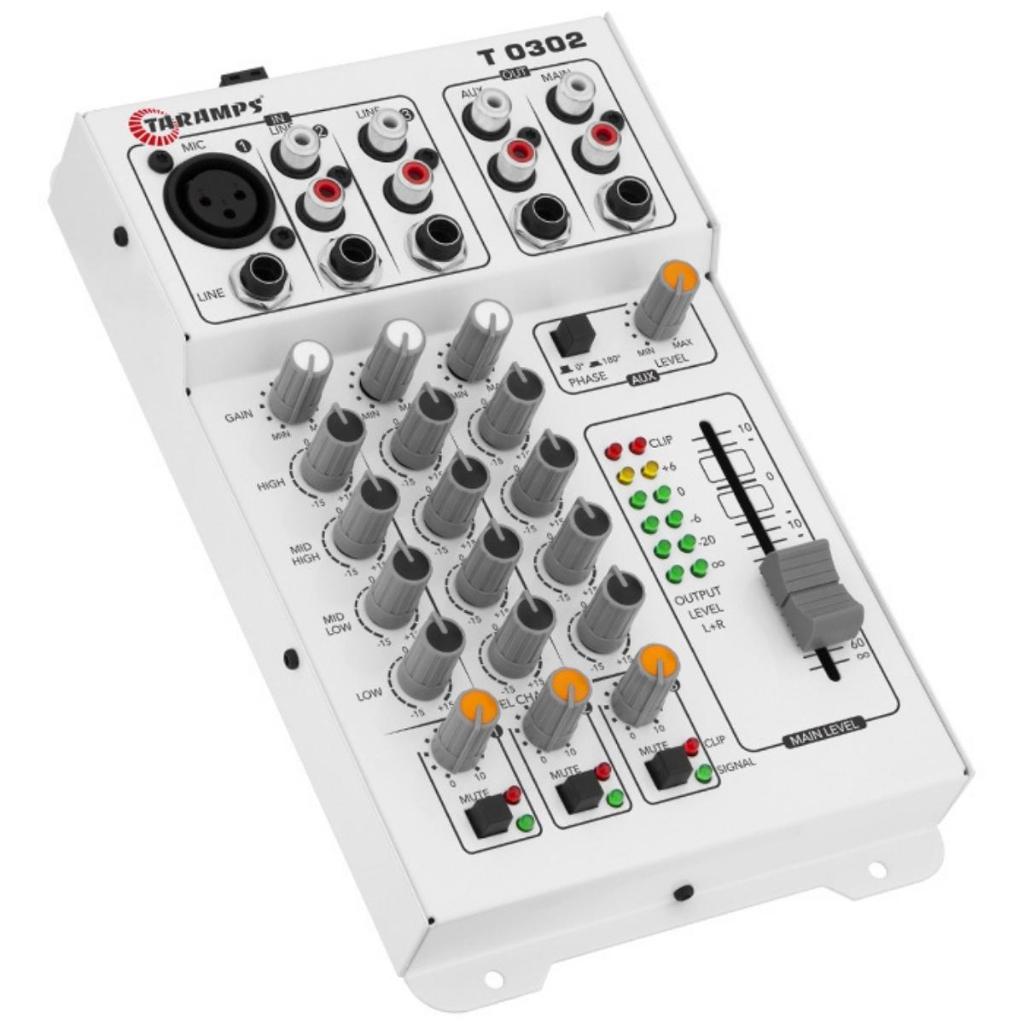 Com a mesa de som T 0302, você pode controlar e mixar o seu sistema de som com muito mais tranquilidade e simplicidade. Os três canais de entrada, com 8 conexões permitem diversas possibilidades de mixagem, dentre elas estão: microfone, players, instrumentos musicais (ex: teclado e violão), e etc. Com ajuste de ganho e Level em todas as vias, possibilita que sua estrutura de ganho fique impecável. Além disso, para dar aquele toque especial na “regulagem”, todas as vias possuem equalização tonal em 4 faixas (graves, médios graves, médios agudos e agudos). E não poderia faltar a indicação visual de cada um dos canais com leds de On, Clipping e Sinal, contando ainda com V.U. de saída onde poderemos garantir mais volume de som sem as indesejadas distorções, garantindo baixíssimo nível de ruídos ou chiados. Através dos dois canais de saída, podemos enviar sinal de áudio para periféricos como equalizadores, processadores de áudio ou diretamente para os amplificadores. Também é possível utilizar a saída auxiliar para enviar áudio para outros sistemas, possibilitando controlar o volume e ajustar fase, corrigindo possíveis cancelamentos. T 0302, qualidade e controle ao seu alcance. • Características NÃO POSSUI LED NOS BOTÕES Resposta de Frequência (-3dB): 2Hz ~ 76Khz Distorção Harmônica Total: <0,009% (T.H.D.) Relação Sinal Ruído (SNR): 112dB Sensibilidade da entrada do canal 1: Mic (XLR) Min: 500mV ~ Max 7mV Line (P10) Min: 620mV ~ Max 7,6mV Sensibilidade das entradas do canal 2/3: Line (P10/RCA) Min: 2,55V ~ Max: 60mV Tensão de Alimentação (POWER): 9 ~ 16 Vdc Consumo Máximo: 350 mA Entrada Remoto (Conector REM): 9 ~ 16 Vdc Saída Remoto (Conector REM): 350 mA Dimensões (LxAxP): 134 × 42 x 220 mm Peso: 0,70 Kg • 4 Bandas de equalização por canal: High +15dB (18KHz) Mid High +15dB (2,4KHz) Mid Low +15dB (240Hz) LOW +15dB (30Hz) • Impedância das entradas do canal 1: Mic (XRL): Desbalanceada 4K Ohms Balanceada 8K Ohms Line (P10): Desbalanceada 8,5K Ohms Balanceada 17KOhms • Impedância das entradas do canal 2: Line (P10): Desbalanceada 95K Ohms Line (RCA): Desbalanceada 95K Ohms • Impedância das saídas: Main Out (P10/RCA): 47R Aux Out (P10/RCA): 47R • Nível máximo das saídas: Main Out (P10/RCA): 18 dBu/6,3 Vac Aux Out (P10/RCA): 18 dBu/6,3 Vac