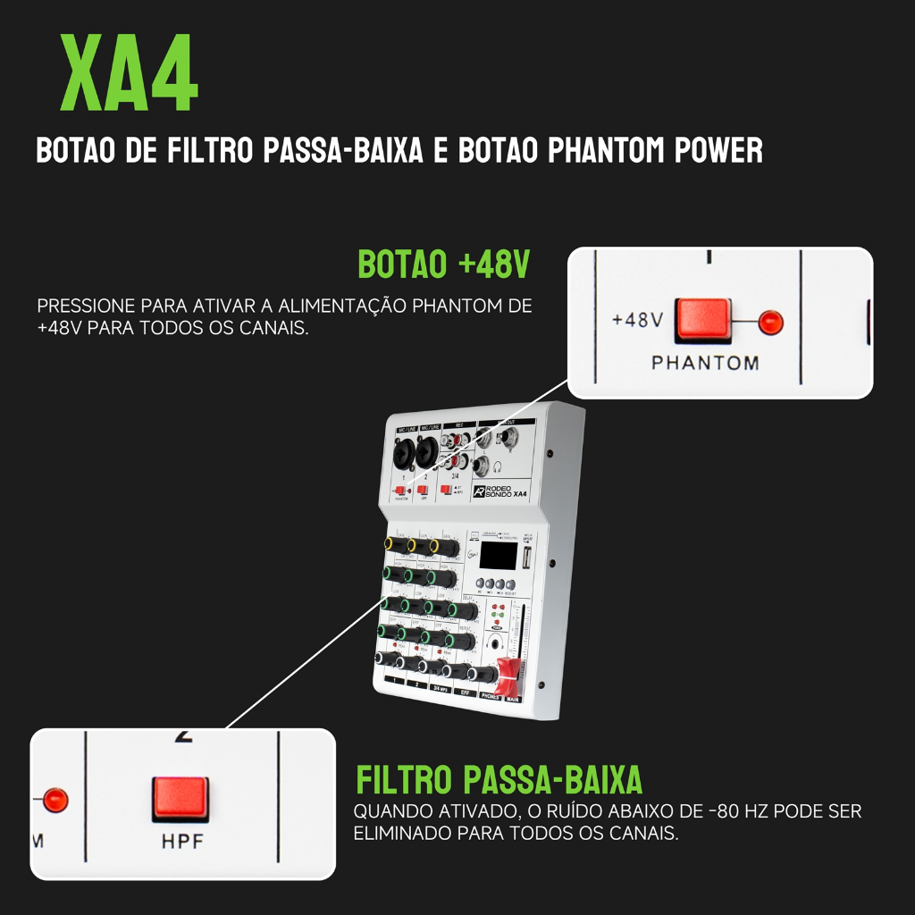 Descrição Mesa de Som GOCHANMI XA4 Mixer de Áudio 4 Canais Bluetooth **Características:** - Alimentação phantom comum de +48V para todas as entradas de microfone. - Reprodutor MP3 digital USB integrado com Bluetooth. - **RETARDO DIGITAL:** O sistema de retardo HI-FI ajuda a obter um melhor efeito de eco. - Controle de ganho e LED de pico para controlar o sinal de entrada e evitar distorções. - 4 entradas mono (Microfone/linha). - Canal de entrada estéreo. - **CONTROLE DE GANHO / INDICADOR DE PICO.** - LED de limitador de pico para cada entrada. - **MONITORAMENTO DE FONES DE OUVIDO** - Saída de fones de ouvido com volume ajustável. - Botões de controle de ganho, grave, médio, agudo, AUX, panorama, faders, efeito, retardo, repetição. - Equalização de entrada: Alto, baixo, médio ± 15dB. - Mesa de som compacta para pequenos PA, gravação e transmissão. - Design leve e portátil com revestimento resistente a impactos. - Criação de efeito de reverberação: Cada entrada mono tem um equalizador de 3 bandas. - **Transmissão ao vivo via U-disk**: Entrada de disco U compatível com transmissão ao vivo. - **Tecnologia Bluetooth**: Transmissão de áudio sem fio diretamente para a mesa de som. - **Compatibilidade múltipla**: Compatível com USB e MP3. Conecte USB, PC, flash drive ou dispositivo Bluetooth para mixar e gravar. **Especificações:** - Entrada de microfone: Resposta de frequência: 10Hz a 200kHz. - Faixa de ganho: +14dB a +60dB. - SNR: 120dB E.I.N. - Entrada de linha: balanceada eletronicamente. - Resposta de frequência: 10Hz a 130kHz. - Faixa de ganho: -6dB a +38dB. - SNR: 95dB E.I.N. - Canais estéreo: Resposta de frequência: 10Hz a 70kHz. - Faixa de ganho: -8 a +15dB. - SNR: 96dB. - Equalização: Baixo: 80Hz, + / - 15dB; Médio: 2.5kHz, + / - 15dB; Alto: 12kHz, + / - 15dB. - Mistura principal: Saídas principais: +22dBu não balanceado. - Envio AUX: +22dBu não balanceado. - Saída de fita: +22dBu não balanceado. - Saída de fones de ouvido: +15dBu / 150Ω. **Tamanho do corpo:** 25x21x3 cm. **Peso:** 1,5 kg.