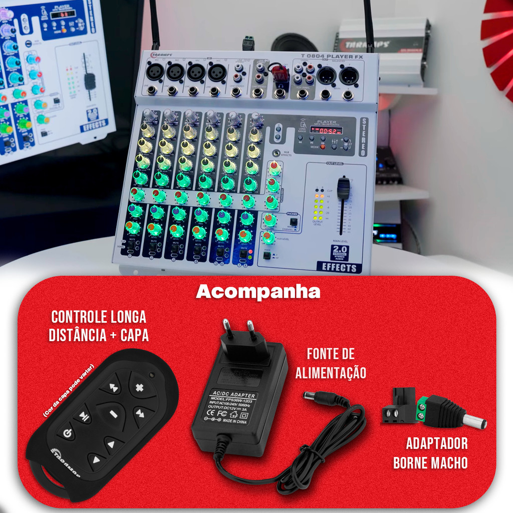 Mesa Taramps T 0804 Player Som Automotivo 8 Canais Bluetooth Usb Fm Equalizador Echo Fx Stereo Rgb Led Audio Automotivo Frete Grátis Pronta Entrega Garantia 12 Meses Controle Remoto Sistema Profissional Microfone Instrumental Multicolor Eleve seu som automotivo ao máximo com a Mesa Taramps T 0804 Player Stereo FX Multicolor! Com 8 canais e múltiplas conexões, esta mesa é perfeita para mixar microfones, instrumentos e players em projetos de alta qualidade, como caixas automotivas ou sistemas profissionais. Seu player integrado oferece Bluetooth, USB e FM, enquanto os efeitos Stereo FX e Echo FX adicionam profundidade e eco ao som. Os LEDs RGB multicoloridos sincronizam luz e música, trazendo um visual impactante ao seu setup! Por que escolher a T 0804 Player Stereo FX? • Flexibilidade: Entradas para microfones e linhas (XLR, P10, RCA). • Efeitos Profissionais: Echo FX com ajustes de tempo e repetição. • Controle Total: Equalização de 4 bandas por canal (±15dB). • Praticidade: Controle remoto incluso para ajustes fáceis. Especificações Técnicas: • Canais: 8 entradas / 2 saídas (Main e Aux) Impedância de Entrada: • Canais 1-4 (Balanceados): Mic (XLR): 1,5K Ohms / Line (P10): 12K Ohms • Canais 5/6 e 7/8 (Desbalanceados): Line (P10/RCA): 10K Ohms • Impedância de Saída: Main e Aux (P10/RCA): 47 Ohms • Nível Máximo de Saída: 18 dBu (6,3V RMS) antes do clip Ganho Geral: • Mic (XLR): +8dB a +50dB • Line (P10): -10dB a +33dB • Line Stereo (RCA): -20dB a +30dB Sensibilidade de Entrada: • Canais 1-4: Mic (XLR): 3mV / Line (P10): 24mV • Canais 5/6 e 7/8: 90mV • Resposta de Frequência: 15Hz 76kHz • Sinal/Ruído: 112dB • Distorção Harmônica (THD): < 0,009% • Equalização por Canal: • High: ±15dB (12kHz) • Mid High: ±15dB (2,5kHz) • Mid Low: ±15dB (300Hz) • Low: ±15dB (80Hz) • Efeitos: Echo FX (50-350ms, 1-12 repetições) • Tensão de Alimentação: 9V 16V DC • Consumo Máximo: 1,65A • Entrada/Saída Remoto: 9-16V DC / 100mA • Dimensões: 302 x 42 x 308 mm • Peso: 2,07 kg • Código Universal / EAN: 7908706601657 • Diferenciais Exclusivos: • Produto 100% original Taramps com garantia de 12 meses. • Brinde especial: Ganhe um relógio funcional (estoque limitado)! • Envio imediato: Postagem em até 24h com rastreio. Com ajustes precisos e LEDs RGB multicoloridos sincronizados com o som, a T 0804 Player Stereo FX entrega qualidade profissional e um visual único. Frete grátis (se aplicável) e pronta entrega para você mixar e curtir agora mesmo! Itens Inclusos: • 1 Mesa Taramps T 0804 Player Stereo FX Multicolor • 1 Relógio funcional (brinde) • 1 Controle remoto