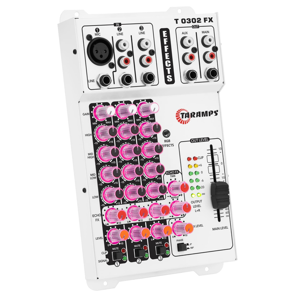 Descubra um mundo de som e luz com a T 0302 FX MULTICOLOR, a primeira mesa do segmento a incorporar efeitos de Led RGB aos botões, tornando cada ajuste uma experiência envolvente. São 69 efeitos de luz distintos, incluindo o cativante efeito VU sincronizado com o ritmo da música. Explore a sinergia perfeita entre som e estética com a T 0302 FX MULTICOLOR. Informações Técnicas • Resposta de Frequência (-3DB): 2Hz ~ 76KHz • Distorção Harmônica Total: <0,009% (T.H.D.) • Relação Sinal/Ruído (SNR): 112dB • Sensibilidade das Entradas: - Canal 1: Mic (XLR) Min: 500mV ~ Max 7mV / Line (P10) Min: 620mV ~ Max 7,6mV - Canal 2/3: Line (P10/RCA) Min: 2,55mV ~ Max: 60mV • 4 Bandas de Equalização Por Canal: - High ± 15dB (12KHz) - Mid High ± 15dB (2,5KHz) - Mid Low ± 15dB (300KHz) - Low ± 15dB (80Hz) • Impedância das Entradas: - Canal 1: Mic (XLR): Desbalanceada 4K Ohms/ Balanceada 8K Ohms - Line (P10): desbalanceada 8,5K Ohms / Balanceada 17K Ohms - Canal 2/3: Line (P10): Desbalanceada 10K Ohms - Line (RCA): Desbalanceada 10K Ohms • ECHO FX TIME / ECHO FX REPEAT: 50 ~ 350ms 1 ~ 12 repetições • Impedâncias das Saídas: - Main Out (P10/RCA): 47R - Aux Out (P10/RCA): 47R • Nível Máxima das Saídas: - Main Out (P10/RCA): 18dBu/6,3Vac - Aux Out (P10/RCA): 18dBu/6,3Vac • Tensão de Alimentação (POWER): 9 ~ 16 Vdc • Consumo Máximo: 470mA a 860mA • Entrada Remoto (Conector REM): 9 ~ 16 Vdc • Saída Remoto (CONECTOR REM): 350 mA • Dimensões (L x A x P): 145x42x242mm • Peso: 0,82Kg
