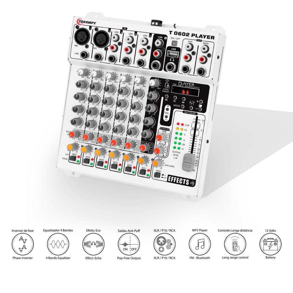DESCRIÇÃO COMPLETA Transforme seu sistema de som com a Mesa Taramps T 0602 Player seis canais de mixagem DSP com efeitos Echo FX e luzes LED RGB tudo isso com conexão Bluetooth USB e rádio FM integrados Ideal para caixas Bob som automotivo ou home studio ela garante praticidade potência e estilo nas suas apresentações. Características: Marca: Taramps Modelo: T 0602 Player Especificações: Cor: Branco Voltagem: 12V Tipo de Console: Analógico Resposta de frequência: 2Hz ~76KHz Direção Harmônica Total: <0,009% (T.H.D.) Relação Sinal/Ruído (SNR): 112dB Sensibilidade da Entrada: Line (P10/RCA) Min: 2,55V ~ Max 60mV Equalização por canal: High ± 15dB (12KHz), Mid High 15dB (2,5KHz), Mid Low 15dB (300Hz), Low 15dB (80Hz) Versão Bluetooth: 4.0 SBC / A2DP Modo de Equalização: POP, ROCK, JAZZ, COUNTRY, NORMAL Nível máximo das saídas: Main Out (P10/RCA): 18 dBu/6,3Vac, Aux Out (P10/RCA): 18 dBu/6,3Vac Dimensões do produto: 21,5 x 4,2 x 23,6 (AxLxP) Conteúdo da embalagem: 1 x Mesa de som Taramps T 0602 Player 1 x Controle remoto 4335 MHz 1 x Conector de alimentação 1 x Conector para remoto Manual e certificado de garantia Garantia: 12 Meses Peso: 1,16