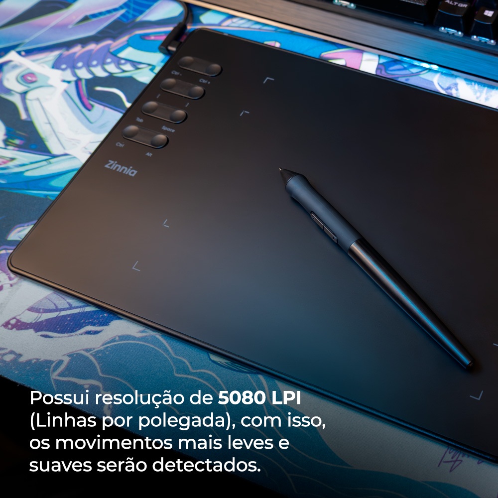 Mesa Digitalizadora Zinnia MT100 Pro A Mesa Digitalizadora Zinnia MT100 Pro é prática por ser precisa e intuitiva, facilitando tarefas como desenho, edição e design com resultados profissionais em seu dia a dia. Ela oferece agilidade ao permitir traços rápidos e mais naturais, além de atalhos personalizáveis que otimizam o fluxo de trabalho, e sua ergonomia reduz o esforço comparado ao uso prolongado de um mouse. PRATICIDADE Sendo compacto e leve, esse aparelho é uma ótima opção para quem busca facilidade e praticidade, tornando-se indispensável para o cotidiano. AGILIDADE Sua sensibilidade ajustável permite que o uso de sua caneta tenha traços precisos e mais ágeis que um mouse, garantindo resultados mais naturais e expressivos. CONFORTO A mesa digitalizadora reduz o esforço físico em longas sessões de trabalho, e o uso da caneta proporciona uma postura mais natural para a mão e o pulso. Marca: Zinnia Modelo: ZNC-ZNMT100-BL02 Dimensões: 286 × 195 × 8,8 mm Área de trabalho (PC): 193 × 143 mm Área de trabalho (Mobile): 193 × 86 mm Sensor de pressão: 16.384 níveis Resolução: 5080 LPI Taxa de relatório máxima: 330 PPS Botões: 8 botões programáveis Inclinação: ±60° Altura de detecção: 15 mm Sistemas compatíveis: - Windows XP / 7 / 8 / 10 / 11 - macOS 11.0 ou posterior - Android 5.0 ou posterior (OTG necessário) Conteúdo da embalagem: - 1x Mesa Digitalizadora MT100 Pro - 1x Caneta EMR EP20 - 8x Pontas para caneta - 1x Removedor de pontas - 1x Cabo USB-C - 1x Adaptador USB-C OTG - 1x Adaptador Micro-USB OTG - 1x Película Protetora Texturizada - 1x Manual do usuário A Pichau Informática, com mais de 18 anos de experiência, é um dos principais nomes no mercado nacional de tecnologia. Comprometida com a qualidade, eficiência e satisfação do cliente, busca constantemente melhorias para oferecer serviços e produtos de excelência.