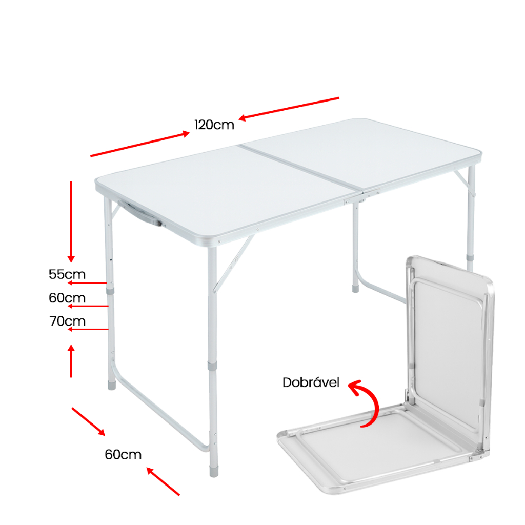 MESA DOBRÁVEL MALETA 120x60CM REFORÇADA – PRATICIDADE E RESISTÊNCIA PARA QUALQUER SITUAÇÃO Já passou pela situação de levar uma mesa para camping ou praia e ela ser instável, fraca ou difícil de transportar? Isso atrapalha o uso e tira totalmente a praticidade que você precisa. Essa mesa dobrável tipo maleta foi desenvolvida justamente para resolver esses problemas, com mais reforço estrutural e estabilidade no uso. Destaques que fazem diferença no uso real: Estrutura reforçada com tubos extras para maior estabilidade Dobrável tipo maleta com alça, fácil de transportar 3 níveis de altura ajustável para diferentes usos Com base no feedback de clientes, essa mesa de camping dobrável recebeu melhorias importantes: reforço em alumínio no tampo e dois tubos extras de sustentação lateral, garantindo mais firmeza durante o uso. Na prática, isso significa menos balanço, mais segurança ao apoiar objetos e uma experiência muito mais confiável, seja como mesa de camping, mesa de praia ou mesa portátil para piquenique. O sistema dobrável transforma a mesa em uma maleta compacta, facilitando o transporte e armazenamento sem ocupar espaço. Além disso, as pernas ajustáveis permitem adaptar a altura conforme a necessidade, tornando o uso mais versátil. Benefícios diretos para o seu dia a dia: Mais estabilidade comparado a mesas comuns Fácil transporte com formato maleta Altura regulável para diferentes situações Ideal para uso interno e externo Montagem rápida e prática Aplicações: Camping Praia Piqueniques Churrascos Uso doméstico Eventos ao ar livre Especificações técnicas: Tipo: Mesa dobrável portátil tipo maleta Material: Estrutura em alumínio / tampo em MDF Dimensões do tampo: 120 x 60 cm Alturas ajustáveis: 55 cm 62 cm 70 cm Capacidade de carga: até 40 kg Peso: 5 kg Se você procura uma mesa dobrável reforçada, estável e fácil de transportar, essa é a escolha ideal para evitar frustração e ter praticidade em qualquer lugar. Leve mais organização, conforto e segurança para seus momentos ao ar livre ou no dia a dia.