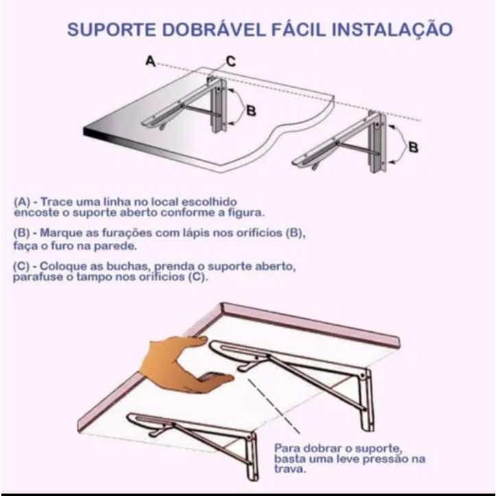 MESA DOBRÁVEL COM SUPORTE – COR BRANCA (FOTO ILUSTRATIVA) mesa com cantos CHANFRADOS Dimensões: ✅ 90cm x 40cm - Suporta até 60kg - Altura do Tampo: 1,5 cm ✅ 120cm x 50cm - Suporta até 60kg - Altura do Tampo: 1,5 cm - Capacidade de Carga: suportam até 50 kg, garantindo segurança e estabilidade para diversas aplicações. Tampo: ⬜ Branca TX : Fabricado em madeira MDF, revestido com melanina que assegura alta qualidade e durabilidade. acabamento nas laterais com fita de borda de pvc - Suporte: Construído em aço carbono com pintura epóxi, o suporte dobrável alia resistência à corrosão e facilidade de uso, permitindo a abertura e fechamento de forma suave e segura. Versatilidade de Uso: Ideal para múltiplas funções, a Mesa Dobrável pode ser utilizada como: ✅ Mesa para refeições; ✅ Estação de trabalho ou estudo com notebook; ✅ Suporte para eletrodomésticos (como micro-ondas, forno elétrico ou Air Fryer); ✅ Penteadeira ou bancada multi-funcional; E muito mais! Benefícios e Diferenciais: - Otimização de Espaço: Perfeita para ambientes compactos, esta mesa dobrou maximiza o aproveitamento dos cômodos sem perder em estilo ou funcionalidade. - Instalação Simples e Rápida: Acompanha todos os itens necessários (suporte e parafusos) e um manual de instalação intuitivo. - Design Moderno e Versátil: Harmoniza com diferentes decorações e estilos, agregando valor estético ao seu ambiente. Invista em praticidade e qualidade. Adquira agora a Mesa Dobrável com Suporte e descubra como um móvel inteligente pode transformar seu ambiente, proporcionando mais conforto e eficiência para o seu dia a dia. Envio Imediato!!!!