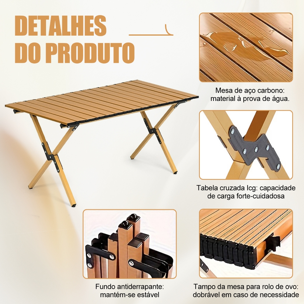 Material de liga de aço atualizado: A mesa de camping leve é feita de material de aço atualizado, que é mais leve e mais durável, fácil de limpar, impermeável e resistente a manchas em comparação com os tampos de madeira. O tampo é fixado por botões aprimorados, evitando que as ripas se soltem facilmente. Portátil e prática: O tampo de chapa de aço pode ser enrolado e as pernas da mesa são dobráveis, com pés antiderrapantes que garantem firmeza em qualquer terreno. Acompanha uma bolsa de transporte, tornando a mesa compacta, fácil de guardar e levar para qualquer lugar. Design em forma de X: As pernas da mesa em forma de X oferecem excelente estabilidade e suporte, mesmo em terrenos irregulares. O design antiderrapante torna a mesa perfeita como mesa de refeição, mesa de churrasco, mesa de jogos ou mesa auxiliar para acampamento, praia, piquenique ou jardim. Ao mover a mesa, segure pelas pernas para maior segurança. Montagem e desmontagem rápidas: A mesa dobrável pode ser montada em apenas 1 minuto. Basta abrir as pernas, fixar as duas barras superiores, deslizar o tampo e prender as peças de ferro para garantir firmeza e estabilidade. Especificações do produto: Tamanho da mesa: 90 × 60 × 45 cm Tamanho da embalagem: 85 × 15 × 20 cm Peso: 5 kg