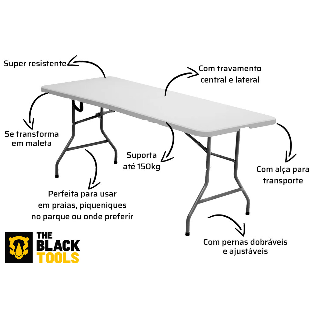 A The Black Tools é uma marca comprometida com a qualidade e as necessidades do cliente. Nosso objetivo é oferecer as melhores soluções para o seu dia a dia, com um design funcional e inovador. MESA DOBRÁVEL E PORTÁTIL VIRA MALETA 180X74X74CM TBT1800 - The Black Tools A Mesa dobrável e portátil TBT1800 da The Black Tools é de alta qualidade para você poder aproveitar um bom dia e melhorar sua experiência; Fabricada com tampo em polipropileno e pés em ferro, ideal para conforto e apoio; Com acabamento de qualidade e materiais resistentes e duráveis. VANTAGENS: - Fácil de transportar, leve, totalmente dobrável e desdobrável com travas de segurança Lock e uma alça para facilitar o transporte; - Proporciona um ambiente visual agradável e confortável; - Design simplista e minimalista, adapta-se a qualquer espaço; - Alça para transporte e transforma-se em maleta. CARACTERÍSTICAS: - Material estrutura: Polipropileno/Ferro; - Dobrável e Portátil; - Suporta até: 150kg; - Cor: Branco. DIMENSÕES: Comprimento estendida: 1,80 mt; Comprimento fechada: 0,90 mt; Largura: 74cm; Altura: 74cm. Marca: The Black Tools Modelo: TBT1800 Garantia: 03 meses Sku: 24813