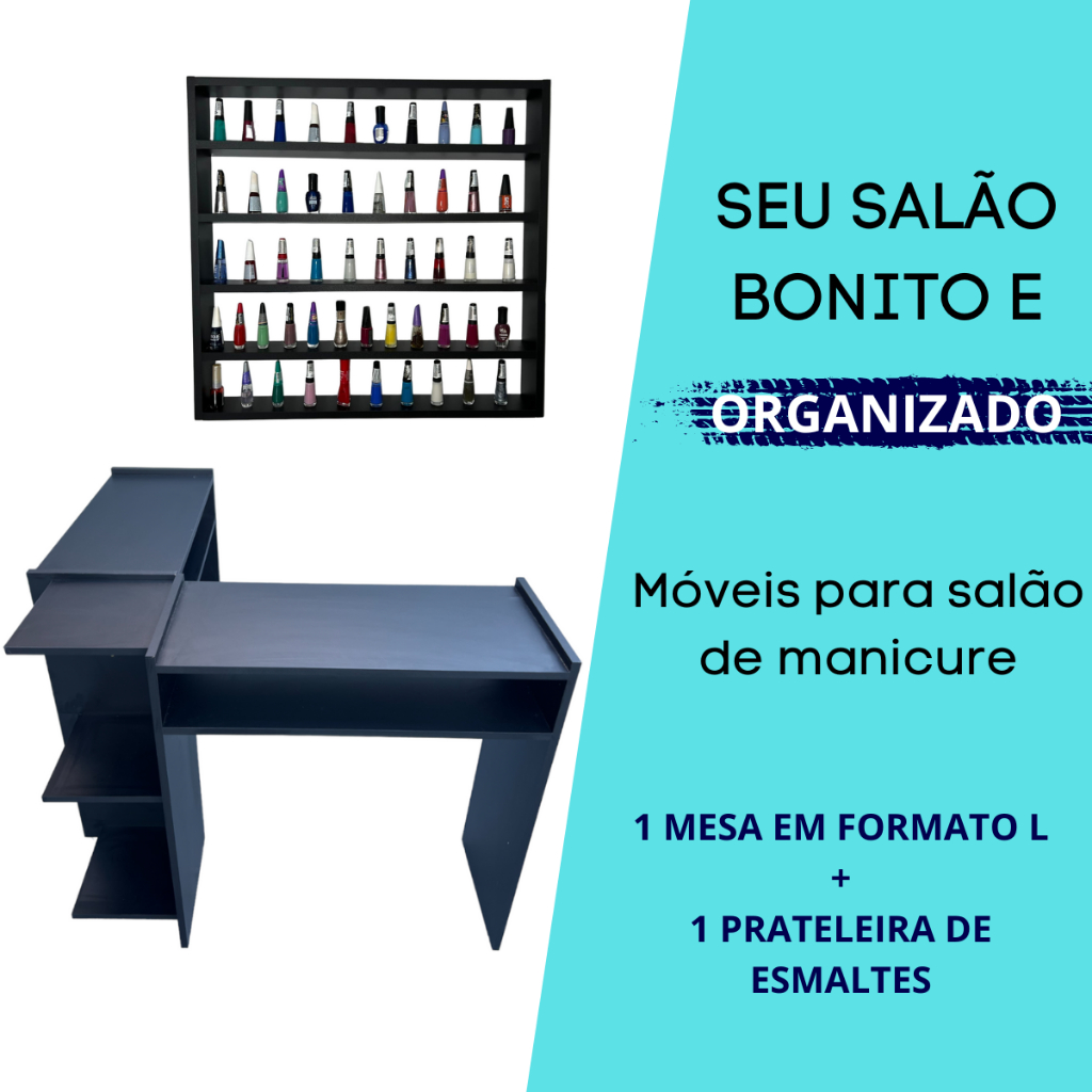 KIT COM 2 ITENS 1 Mesa Manicure em L + 1 Expositor de Esmaltes MEDIDAS DA MESA: - Comprimento: 1.00 metro de cada lado - Largura: 30 centímetros - Altura: 77 centímetros DESCRIÇÃO DO PRODUTO: - COR: Branca ou Preta - Mesa em MDF de 15 mm - Com 1 prateleira bem útil - Bem resistente e não balança - Suporta até 20 Kg - Kit de montagem MEDIDAS DO EXPOSITOR: - Altura: 64 cm - Largura: 7 cm - Comprimento: 67 cm DESCRIÇÃO DO EXPOSITOR: - Acompanha suporte de fixação, parafusos e buchas. - Com 5 prateleiras para 200 esmaltes. - Fabricado em MDF de 15 mm. - Suporta até 30 Kg. - Branco ou Preto Tenha um atendimento profissional no seu salão, com esse kit exclusivo e essencial para você que preza por beleza, praticidade e organização. Dúvidas Frequentes: 1. Os produtos são enviados desmontados? R. Sim, para evitar danos no transporte nós enviamos os nossos produtos desmontados. 2. A montagem é fácil? R. Muito fácil, os nossos produtos podem ser montados apenas com uma simples chave philips, além disso, acompanha manual de montagem, todos os furos já feitos, parafusos e acessórios. 3. O produto está disponível à pronta entrega? R. Todos os nossos produtos são para pronta entrega. 4. O produto acompanha nota fiscal? R. Emitimos nota fiscal para todos os clientes que compram os nossos produtos. 5. Como são realizadas as entregas? R. As entregas são feitas exclusivamente através do Shopee Xpress que pertence a Shopee. Toda a Responsabilidade da entrega e calculo no valor de frete pertence a Shopee. Ainda tem alguma dúvida? Utilize o campo de perguntas a baixo que responderemos o mais rápido possível. Política de devolução: A nossa política de devolução é bastante flexível, aceitamos devoluções por qualquer motivo em até 07 (sete) dias corridos após o recebimento do seu pedido. A devolução também é válida caso o produto esteja em desacordo com a compra. Garantia: 90 dias contra possíveis defeitos de fabricação.