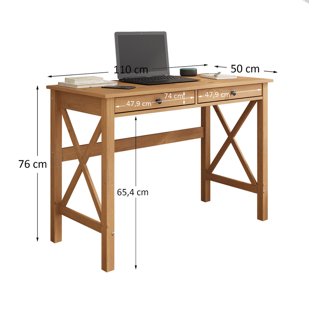 A Escrivaninha em X Estruturada Madeira Maciça Freijó Adrian combina design rústico-industrial e funcionalidade em um móvel sofisticado e versátil. Feita em madeira maciça, sua estrutura robusta com acabamento em Freijó valoriza os veios naturais da madeira, trazendo um toque acolhedor e atemporal ao ambiente. Com duas gavetas espaçosas, A Mesa de Escritório Rústico Industrial Madeira Maciça Adrian oferece praticidade para manter materiais organizados, enquanto seu tampo amplo e resistente acomoda notebooks, livros e itens essenciais do dia a dia. As laterais com travamento em "X" garantem estabilidade e um visual marcante, perfeito para quem busca um espaço de trabalho elegante e funcional. Seu tamanho compacto (110x50x76 cm) permite o uso em diferentes ambientes, como home office, quarto ou sala, podendo até ser utilizada como aparador decorativo. Fácil de montar e limpar, a Mesa Escrivaninha Adrian é a escolha ideal para quem valoriza qualidade, praticidade e um design sofisticado. Dimensões do Produto Largura: 110 cm Altura: 76 cm Profundidade: 50 cm Peso: 14 Kg Materiais e Acabamento Material da Estrutura: Madeira Maciça Finger Tipo da Madeira: Pinus Fundos das Gavetas: MDF CARB Puxadores: Em couro Escala de Brilho: Fosco Material dos Pés: Pinus Maciço Recomendação de Limpeza: Utilize pano levemente úmido Características do Produto Quantidade de Prateleiras: 0 Quantidade de Portas: 0 Quantidade de Gavetas: 2 Tipo de Corrediças: Telescópicas Possui Rodízio: Não Possui Gavetas: Sim Estilo: Moderno Ambiente Principal: Quarto ou Escritório Precisa de Montagem: Sim Sistema de Montagem: Minifix / Cavilhas / Parafusos. Complexidade da Montagem: Fácil Volumes: 01 Garantia do Fabricante: 12 meses Montagem: Recomendamos que seja feita por um profissional. Diferenciais: - Produto Versátil - Design Moderno - Madeira Maciça - Mais Resistente que MDF - Móvel Sustentável - Madeira Certificada - Pintura Livre de Solventes - MDF Livre de Formaldeído - Produto Qualidade Europeia Madeira Maciça: Nossa madeira é proveniente de recursos naturais e é tratada de forma ecologicamente correta para o bem do meio ambiente. Sua resistência e vida útil é superior a móveis de chapa MDF utilizadas pelo mercado. Nossa madeira possui mais resistência ao desgaste natural do tempo, agregando mais durabilidade ao seu produto. Pensando na qualidade dos produtos, possuímos equipes de controle de qualidade para selecionar madeiras ideais para seu produto. Informações Importantes: - Montagem não inclusa ao produto. - Não nos responsabilizamos, no ato da entrega, por subir escadas/elevadores ou transporte por guincho em apartamentos. Eventuais despesas são de responsabilidade do comprador. - Ao receber a mercadoria, o cliente deve verificar as condições da embalagem, caso haja alguma avaria não assine o comprovante de recebimento. - Objetos que ambientam as fotos não acompanham o produto. - Imagens meramente ilustrativas. Cores e tonalidades podem variar. - O conjunto não pode ficar exposto ao Sol ou Chuva.