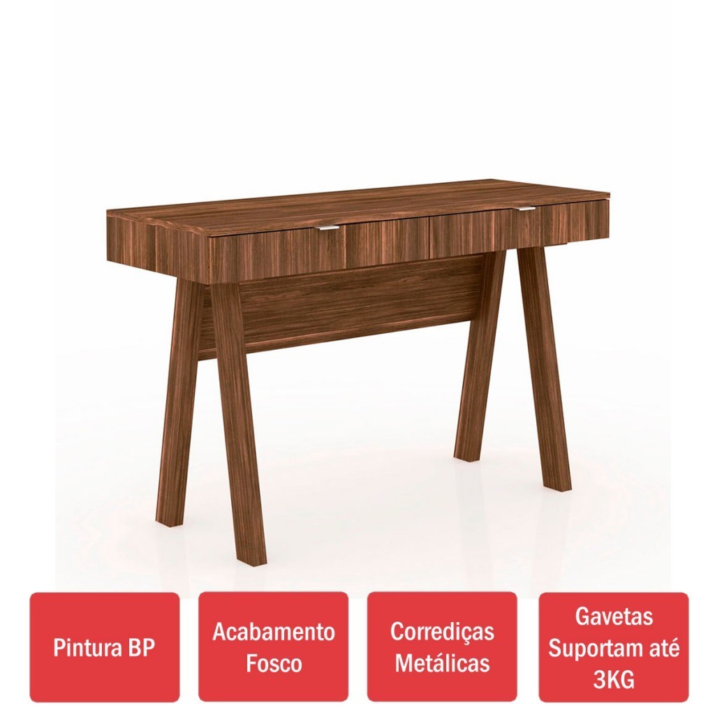 Descrição: Não acompanha objetos de decoração. Características: - Como os Móveis Chegarão na Minha Casa: Desmontados, em caixas, acompanhados de todas as peças, ferragens e manuais para montagem - É frágil?: Sim - Possui Borda de PVC nas Bordas?: Não - Material do Puxador: PVC - Pés com regulagem de altura?: Não - Peso Suportado nas Gavetas (kg): 3 - Material das Corrediças: Metálica - Quantidade de Puxadores: 2 - Material do Tampo: MDP - Quantidade de Gavetas: 2 - Pode Ser Montado Invertido: Não - Possui Vidro: Não - Possui espelho?: Não - Peso suportado no topo (Kg): 20 - Observação: Objetos decorativos que aparecem na imagem não acompanham o produto. - Necessita de Montagem: Sim - Sistema de Montagem: Minifix e cavilha - Indicação de Uso: Escritório - Possui Sapatas?: Não - Tipo de Mesa: Escrivaninha - Formato da Mesa: Formato Retangular - Material das Dobradiças: Não Possui - Possui Rodízios?: Não - Garantia (dias): 90 - Grau de Dificuldade da Montagem: Fácil - Recomendação de Manutenção: Utilizar somente pano úmido e sabão neutro - Peso Suportado nas Gavetas (Kg): 3 Kg - Revestimento /Acabamento: Pintura BP - Possui Espelho?: Não - Material do Puxador: Plástico - Possui Gavetas?: Não - Possui Portas?: Não - Possui Puxadores?: Sim - Material das Corrediças: Metálica - Possui Prateleiras?: Não - Material da Estrutura: MDF e MDP - Escala de Brilho: Fosco