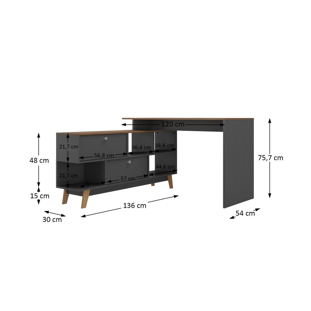 Mesa Escrivaninha em L 120x136cm Retrô 2 Portas Pés Madeira Maciça Nogal/Grafite