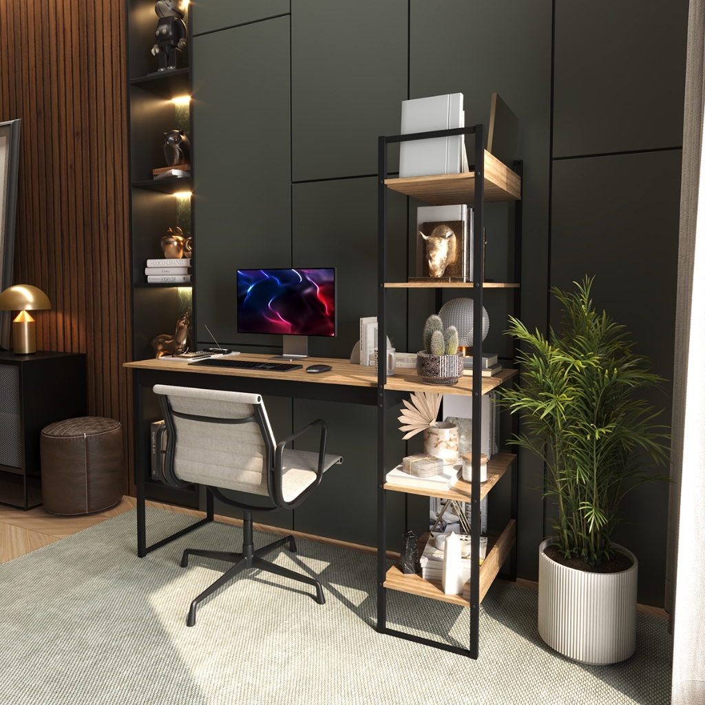 Esta mesa escrivaninha hiper moderna com estante acoplada é a escolha ideal para escritórios e quartos que buscam funcionalidade e estilo. Perfeita para decorações modernas, vintage, nórdicas e minimalistas, ela se destaca pelo seu design elegante e prático. Fabricada em MDP e metal, oferece resistência e longa durabilidade. Suas cinco prateleiras proporcionam amplo espaço para armazenamento e organização. Confira as dimensões completas nas imagens.