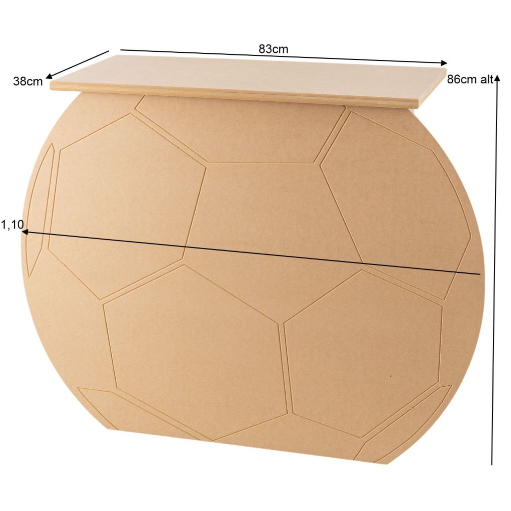 ATENÇÃO! FOTO ILUSTRATIVA!!! Medidas da mesa montada: 110cm (largura) x 38cm (profundidade) x 86cm (altura) Tampo 83comp x 38prof Material: MDF cru (sem pintura) Espessura: Estrutura com 6mm | Tampo com travas de 15mm Tampo removível | Produto dobrável e desmontável Mesa Dobrável Bola de Futebol em MDF – Ideal para Festas e Decorações Temáticas Mesa temática em formato de bola de futebol, perfeita para decorações de festas infantis, eventos esportivos, escolas, aniversários ou vitrines com tema futebol. Design funcional e criativo, fácil de montar e desmontar, com excelente aproveitamento de espaço graças à estrutura dobrável. Produzida em MDF cru, pronta para personalização com pintura, adesivação ou aplicação de acabamentos conforme o tema do seu evento. Destaques do produto: Mesa dobrável com tampo removível Ideal para ambientes temáticos ou decorações esportivas Estrutura firme com excelente durabilidade Produto artesanal, prático e reutilizável Ótima opção para organizadores de eventos e decoradores Atenção: As tonalidades do MDF podem variar de acordo com os lotes recebidos. Compra Limitada: Para garantir que o produto chegue em perfeitas condições, por favor, adquira apenas 1 unidade por venda. A compra de duas ou mais unidades pode exceder o peso permitido para o envio. Mesa bola de futebol, Mesa temática futebol, Mesa MDF para festa esportiva, Decoração futebol infantil, Mesa dobrável MDF, Mesa desmontável para festas, Mesa temática para aniversário, Mesa MDF personalizada, Tampo removível mesa, Enfeite futebol decoração, Mesa para festa tema esportivo, Mesa MDF bola de futebol, Móveis para decoração de festas, Mesa artesanal esportiva, Mesa decorativa futebol, Mesa para evento infantil, Suporte decorativo bola de futebol, Mesa temática MDF cru, Móveis temáticos festa infantil, Mesa decorativa para painéis