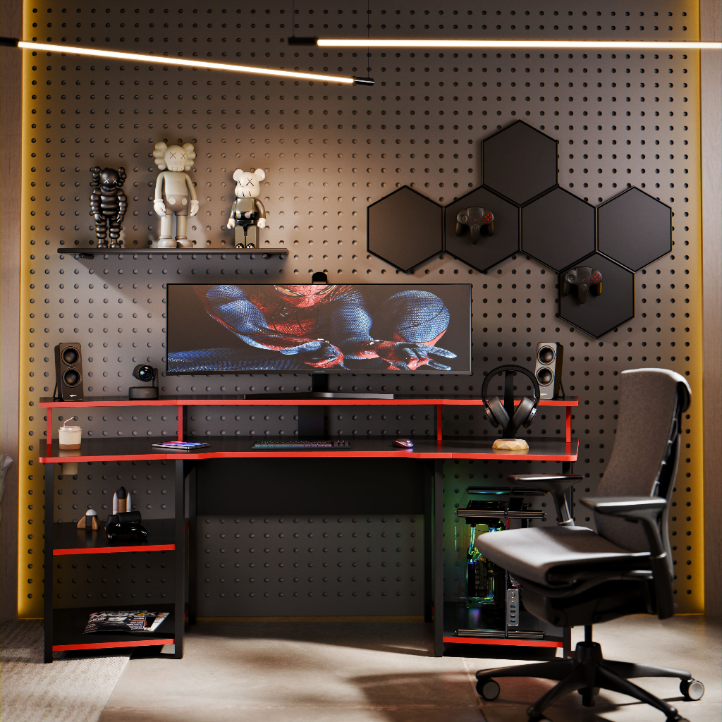 🎮 MESA GAMER ESCRIVANINHA Monte seu setup gamer completo com esta mesa gamer de 186,6 cm de largura. O design em preto com detalhes em vermelho deixa o ambiente moderno e combina com periféricos e iluminação RGB. O tampo amplo e as prateleiras laterais ajudam a organizar monitor, teclado, mouse, CPU e acessórios. 🕹️ DESIGN E FUNCIONALIDADE Mesa em formato reto com superfície ampla para monitor, teclado e mouse. Prateleira superior elevada em toda a extensão da mesa, ideal para monitor, caixas de som e objetos decorativos. Nicho lateral para CPU, mantendo o gabinete bem posicionado e longe do chão. Prateleiras laterais para livros, jogos, controles e outros itens do dia a dia. Furo passa-fios no tampo, facilitando a organização dos cabos do computador e periféricos. 📏 MEDIDAS APROXIMADAS Largura total: 186,6 cm Profundidade: 70 cm Altura total até a prateleira superior: 89,5 cm Recomenda-se conferir as medidas do ambiente antes da compra. 📦 CAPACIDADE DE PESO (DISTRIBUÍDO) Tampo principal (parte central): até 15 kg Prateleira superior (cada módulo): até 5 kg Prateleiras laterais e nichos inferiores: até 10 kg cada Não exceder os limites de peso e sempre distribuir a carga de forma uniforme. 🪵 MATERIAL E ACABAMENTO Estrutura em madeira reconstituída (MDF/MDP), indicada para uso diário em setup gamer e home office. Acabamento liso de fácil limpeza, bastando pano macio levemente umedecido e, se necessário, sabão neutro. 📦 CONTEÚDO DA EMBALAGEM 1 mesa gamer/escrivaninha desmontada Kit de ferragens Manual de montagem ilustrado 🛠️ MONTAGEM O produto é enviado desmontado. Recomenda-se que a montagem seja feita por duas pessoas em superfície plana, seguindo o manual passo a passo. Utilizar apenas as ferramentas indicadas, como chave Philips. Antes de iniciar, conferir se todas as peças e ferragens estão de acordo com a descrição do manual. ✨ CUIDADOS E CONSERVAÇÃO Não expor o móvel à água, sol direto ou umidade excessiva. Não usar produtos abrasivos na limpeza. Evitar arrastar o móvel já montado; para mover, levantar a peça. ⚠️ IMPORTANTE – ITENS QUE NÃO ACOMPANHAM O PRODUTO As imagens ambientadas são ilustrativas. Não acompanham o produto: cadeira, monitor, computador, CPU, teclado, mouse, mousepad, headset, caixas de som, luminárias, consoles, livros, enfeites e demais objetos mostrados nas fotos. O anúncio refere-se somente à mesa gamer descrita.