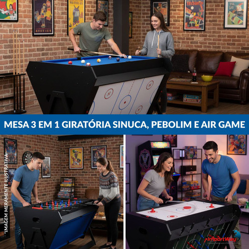 Mesa Giratória MDF 3 em 1 Bilhar Pebolim e Air Game com Acessórios Completos Ventilador Integrado Bivolt Diversão Total